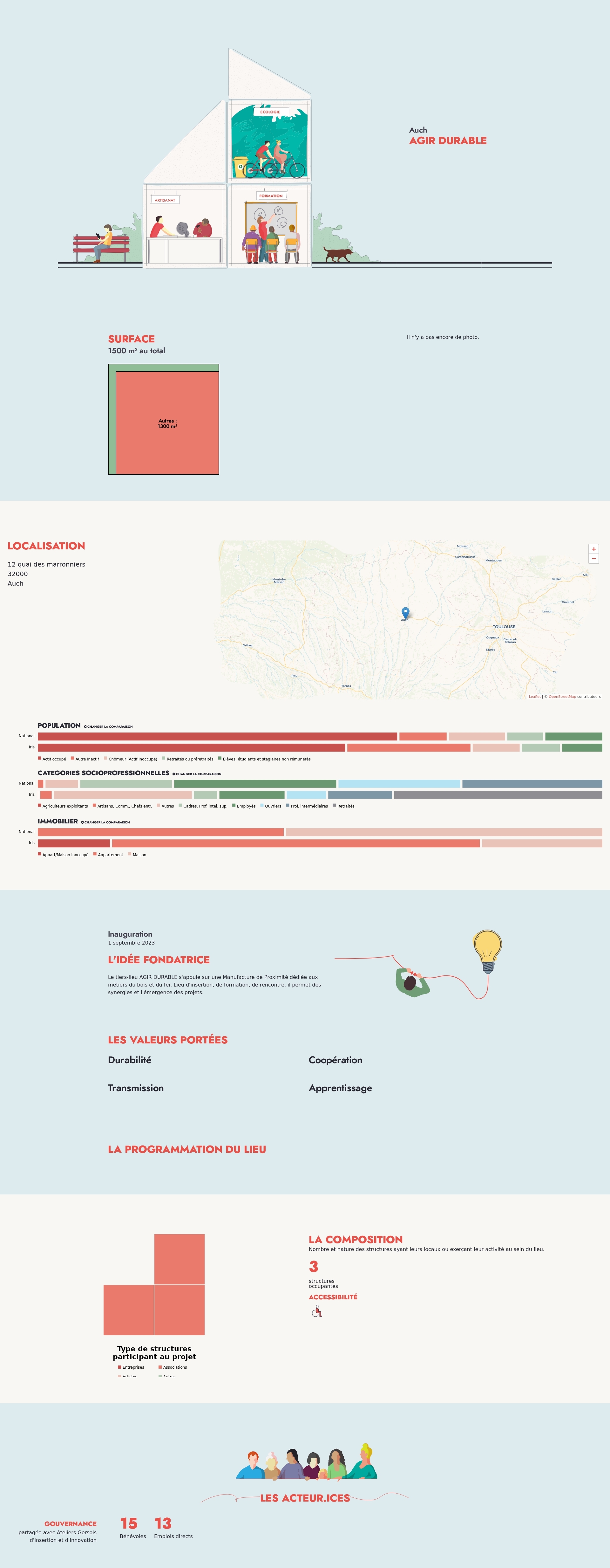 Le tiers-lieu AGIR DURABLE s'appuie sur une Manufacture de Proximité dédiée aux métiers du bois et du fer. Lieu d'insertion, de formation, de rencontre, il permet des synergies et l'émergence des projets.