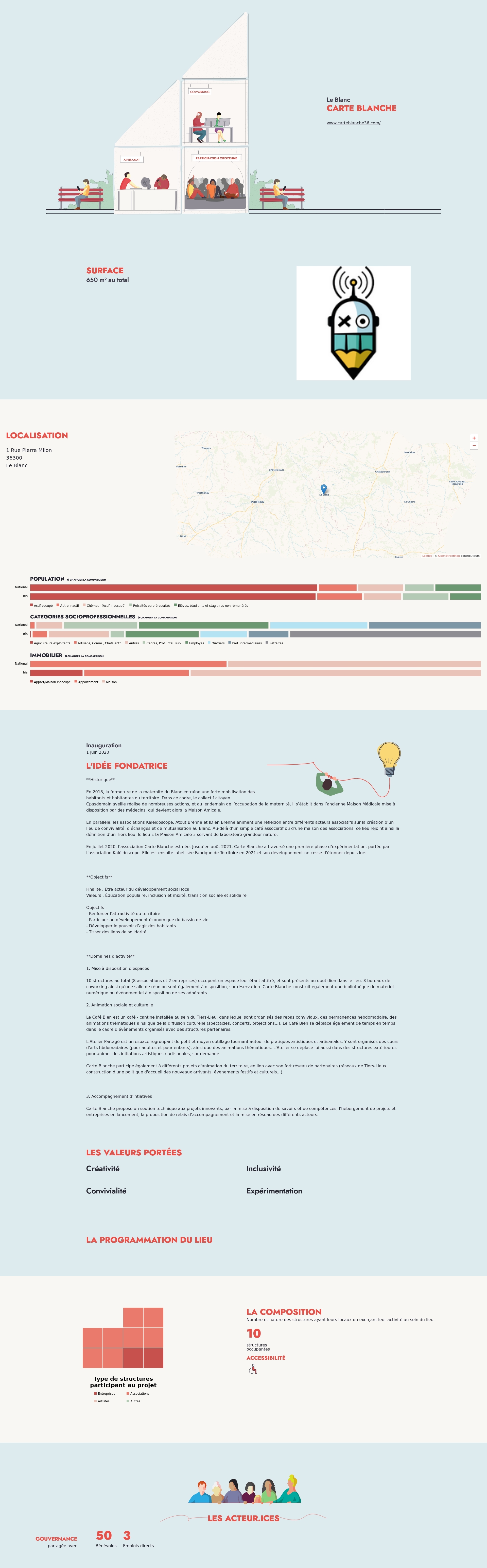 En juillet 2020, l’association Carte Blanche est née. Jusqu’en août 2021, Carte Blanche a traversé une première phase d’expérimentation, portée par l’association Kaléidoscope. Elle est ensuite labellisée Fabrique de Territoire en 2021 et son développement ne cesse d'étonner depuis lors.