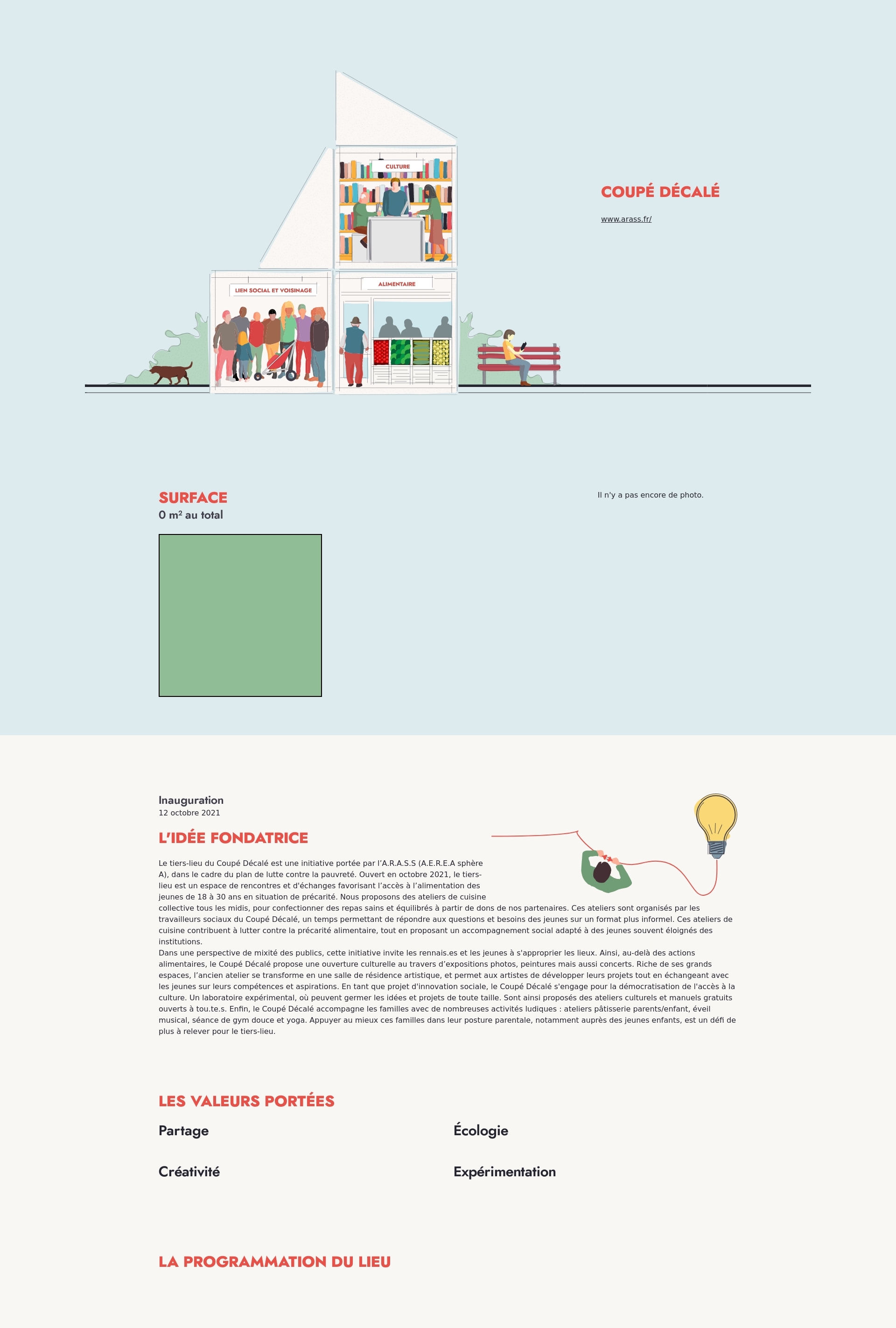 Dans une perspective de mixité des publics, cette initiative invite les rennais.es et les jeunes à s'approprier les lieux. Ainsi, au-delà des actions alimentaires, le Coupé Décalé propose une ouverture culturelle au travers d’expositions photos, peintures mais aussi concerts. Riche de ses grands espaces, l’ancien atelier se transforme en une salle de résidence artistique, et permet aux artistes de développer leurs projets tout en échangeant avec les jeunes sur leurs compétences et aspirations. En tant que projet d'innovation sociale, le Coupé Décalé s'engage pour la démocratisation de l'accès à la culture. Un laboratoire expérimental, où peuvent germer les idées et projets de toute taille. Sont ainsi proposés des ateliers culturels et manuels gratuits ouverts à tou.te.s. Enfin, le Coupé Décalé accompagne les familles avec de nombreuses activités ludiques : ateliers pâtisserie parents/enfant, éveil musical, séance de gym douce et yoga. Appuyer au mieux ces familles dans leur posture parentale, notamment auprès des jeunes enfants, est un défi de plus à relever pour le tiers-lieu.