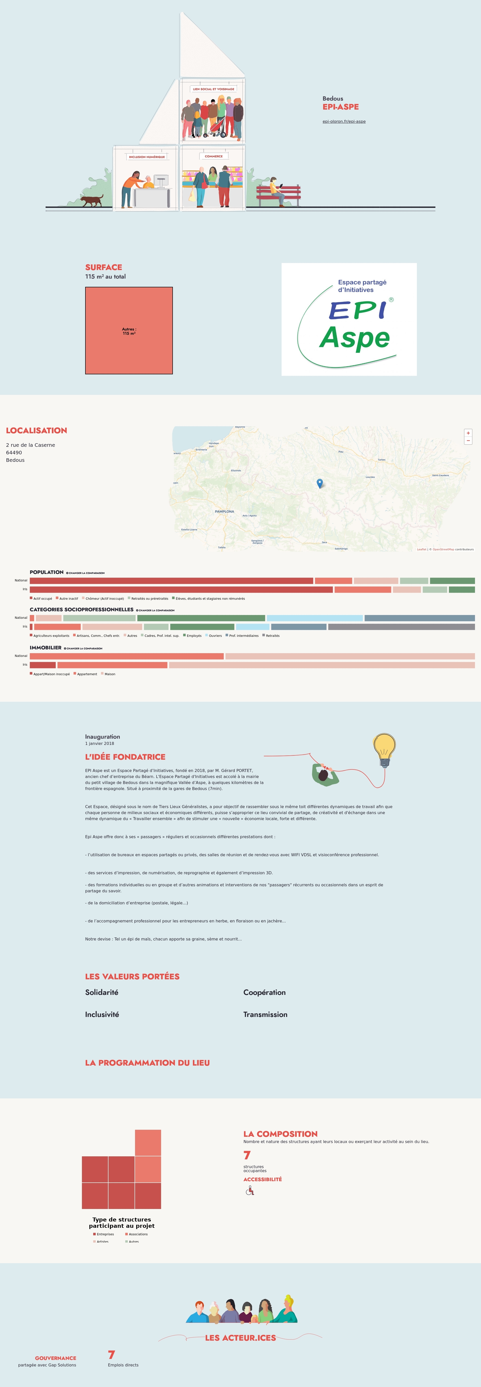 EPI Aspe est un Espace Partagé d’Initiatives, fondé en 2018, par M. Gérard PORTET, ancien chef d’entreprise du Béarn. L'Espace Partagé d'Initiatives est accolé à la mairie du petit village de Bedous dans la magnifique Vallée d’Aspe, à quelques kilomètres de la frontière espagnole. Situé à proximité de la gares de Bedous (7min).