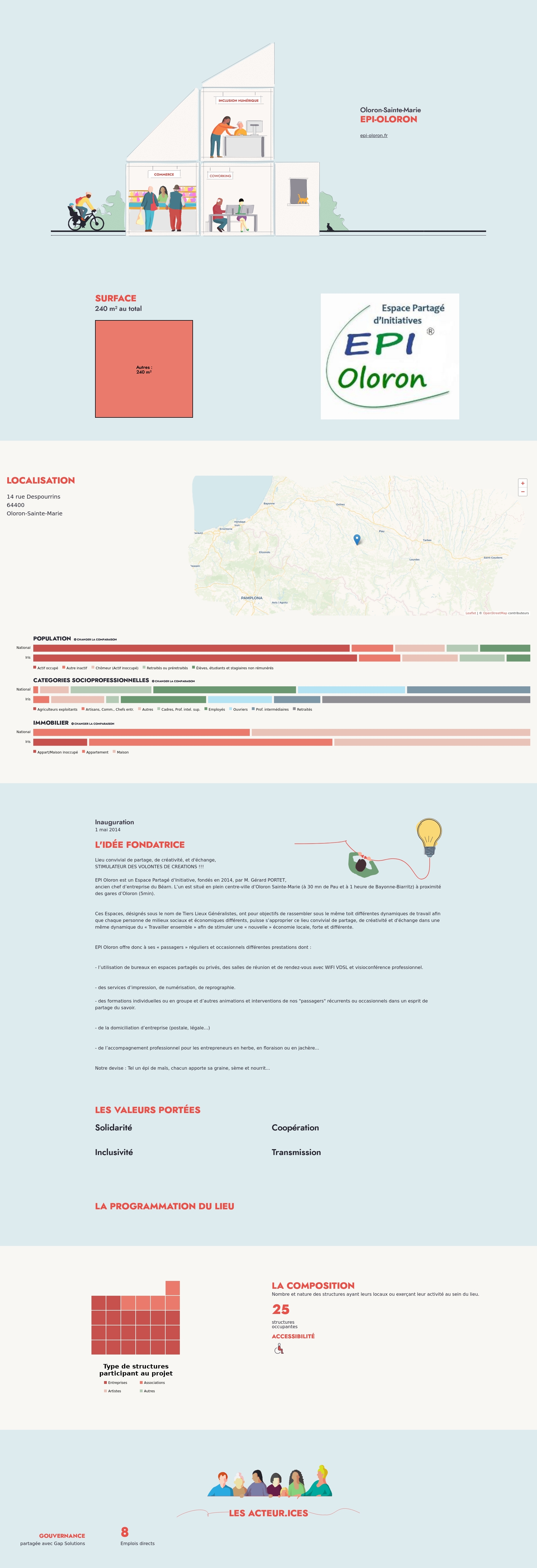 EPI Oloron est un Espace Partagé d’Initiative, fondés en 2014, par M. Gérard PORTET, ancien chef d’entreprise du Béarn. L’un est situé en plein centre-ville d’Oloron Sainte-Marie (à 30 mn de Pau et à 1 heure de Bayonne-Biarritz) à proximité des gares d’Oloron (5min).