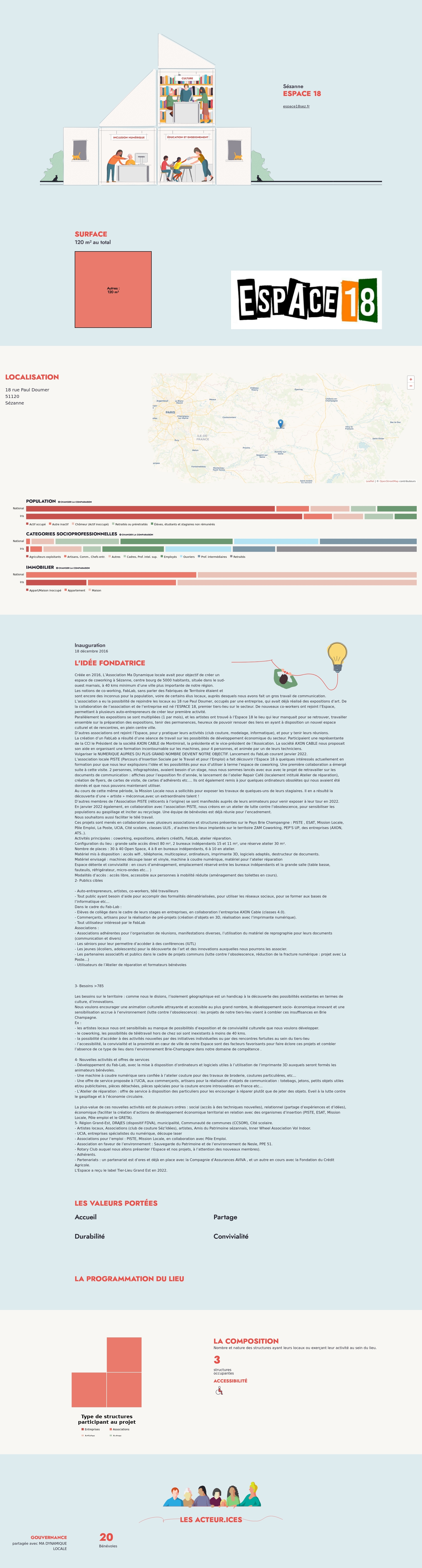 L’association a eu la possibilité de rejoindre les locaux au 18 rue Paul Doumer, occupés par une entreprise, qui avait déjà réalisé des expositions d’art. De la collaboration de l’association et de l’entreprise est né l’ESPACE 18, premier tiers-lieu sur le secteur. De nouveaux co-workers ont rejoint l’Espace, permettant à plusieurs auto-entrepreneurs de créer leur première activité.