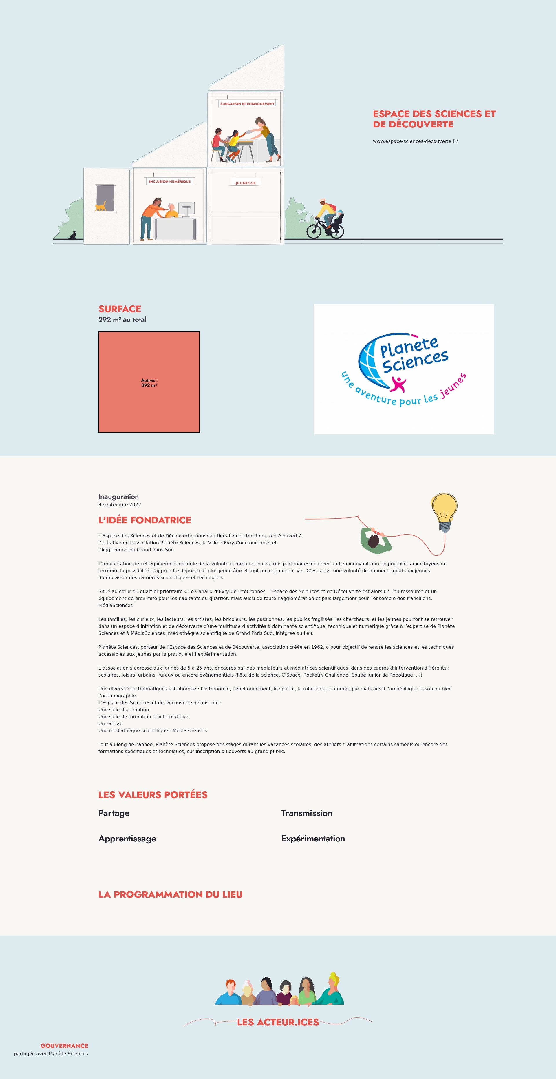 Les familles, les curieux, les lecteurs, les artistes, les bricoleurs, les passionnés, les publics fragilisés, les chercheurs, et les jeunes pourront se retrouver dans un espace d’initiation et de découverte d’une multitude d’activités à dominante scientifique, technique et numérique grâce à l’expertise de Planète Sciences et à MédiaSciences, médiathèque scientifique de Grand Paris Sud, intégrée au lieu.