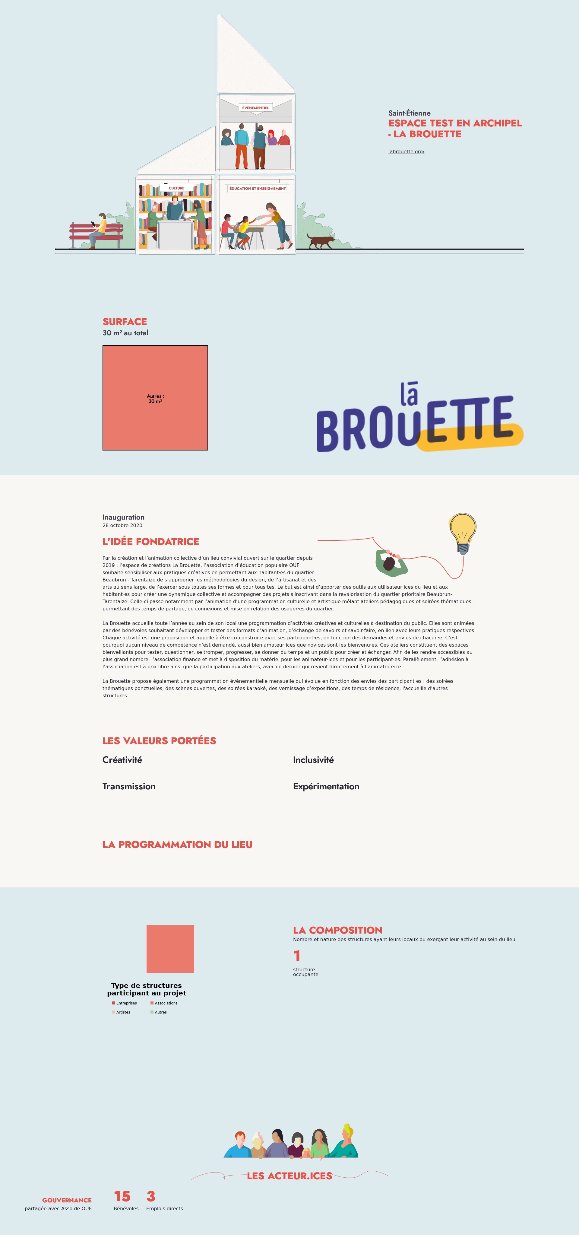 Par la création et l’animation collective d’un lieu convivial ouvert sur le quartier depuis 2019 : l’espace de créations La Brouette, l’association d’éducation populaire OUF souhaite sensibiliser aux pratiques créatives en permettant aux habitant·es du quartier Beaubrun - Tarentaize de s’approprier les méthodologies du design, de l’artisanat et des arts au sens large, de l’exercer sous toutes ses formes et pour tous·tes. Le but est ainsi d’apporter des outils aux utilisateur·ices du lieu et aux habitant·es pour créer une dynamique collective et accompagner des projets s'inscrivant dans la revalorisation du quartier prioritaire Beaubrun-Tarentaize. Celle-ci passe notamment par l’animation d’une programmation culturelle et artistique mêlant ateliers pédagogiques et soirées thématiques, permettant des temps de partage, de connexions et mise en relation des usager·es du quartier.