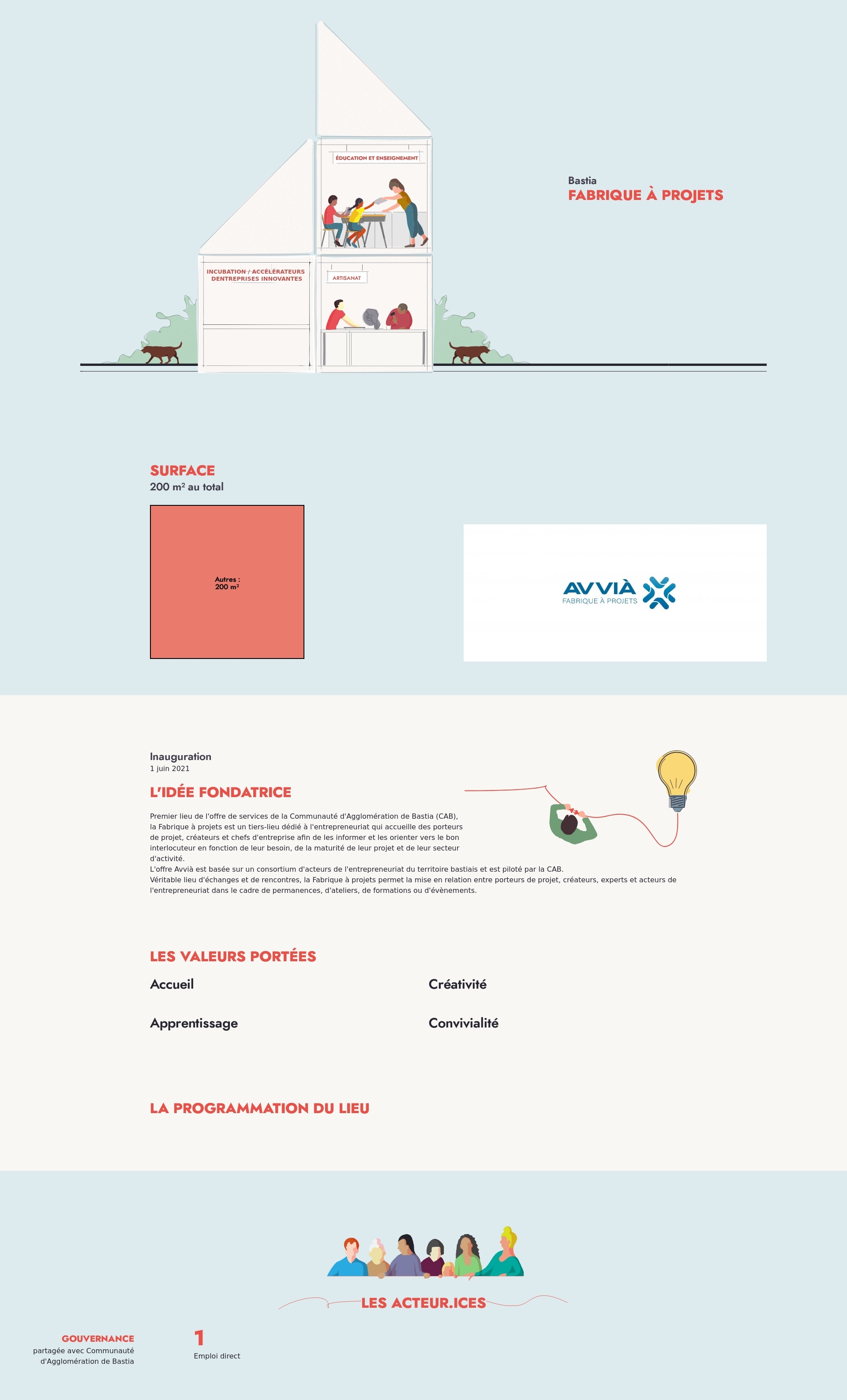 Premier lieu de l'offre de services de la Communauté d'Agglomération de Bastia (CAB), la Fabrique à projets est un tiers-lieu dédié à l'entrepreneuriat qui accueille des porteurs de projet, créateurs et chefs d'entreprise afin de les informer et les orienter vers le bon interlocuteur en fonction de leur besoin, de la maturité de leur projet et de leur secteur d'activité.