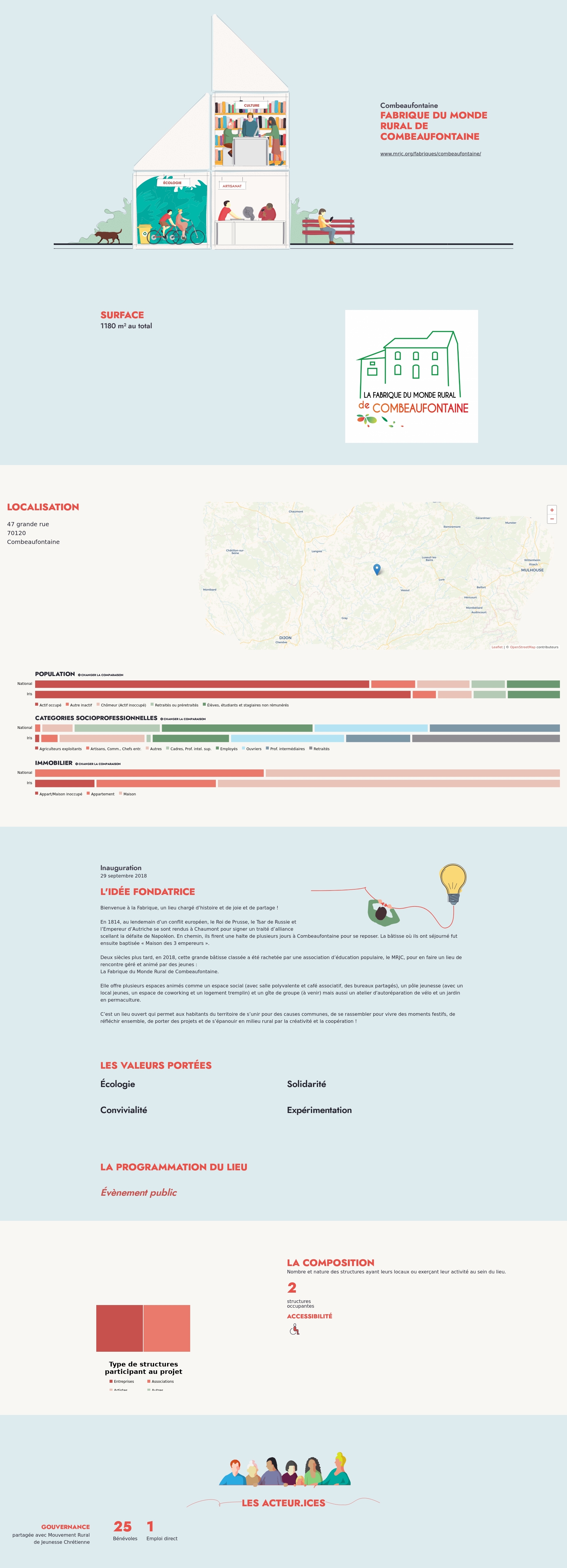 Elle offre plusieurs espaces animés comme un espace social (avec salle polyvalente et café associatif, des bureaux partagés), un pôle jeunesse (avec un local jeunes, un espace de coworking et un logement tremplin) et un gîte de groupe (à venir) mais aussi un atelier d'autoréparation de vélo et un jardin en permaculture.