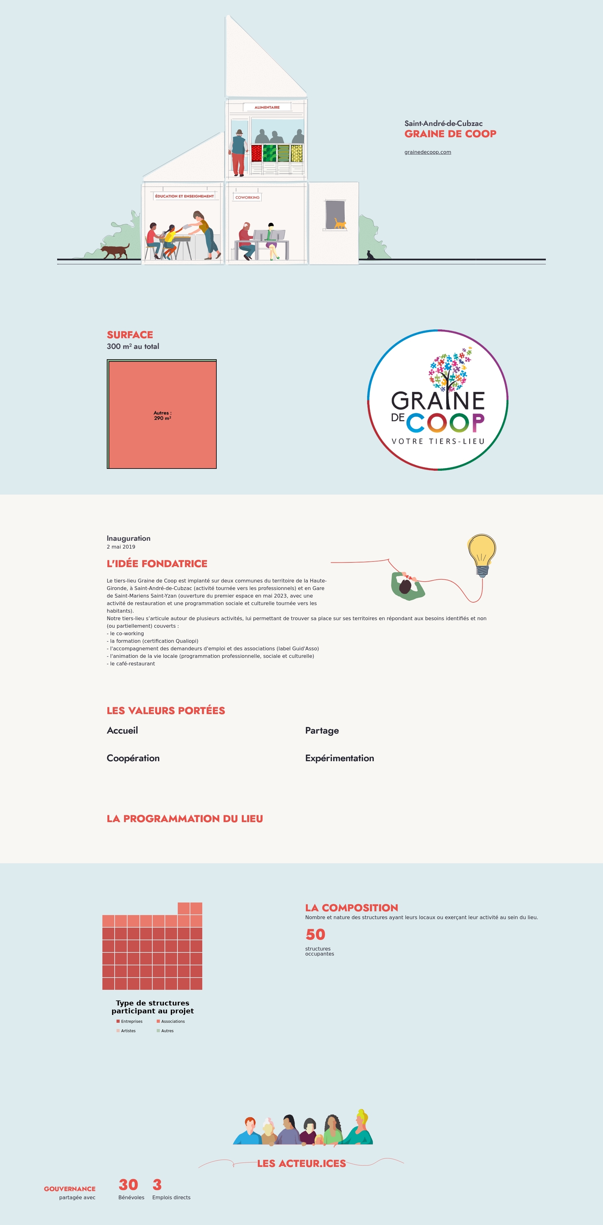 Le tiers-lieu Graine de Coop est implanté sur deux communes du territoire de la Haute-Gironde, à Saint-André-de-Cubzac (activité tournée vers les professionnels) et en Gare de Saint-Mariens Saint-Yzan (ouverture du premier espace en mai 2023, avec une activité de restauration et une programmation sociale et culturelle tournée vers les habitants).