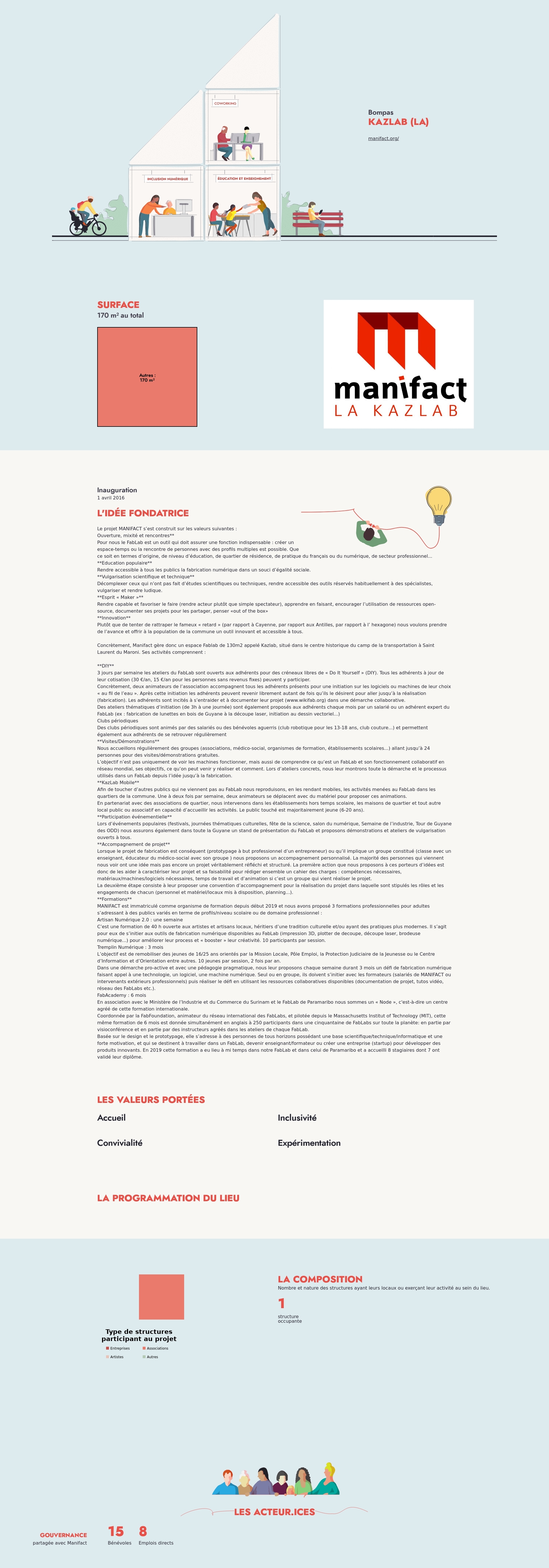 Concrètement, Manifact gère donc un espace Fablab de 130m2 appelé Kazlab, situé dans le centre historique du camp de la transportation à Saint Laurent du Maroni. Ses activités comprennent :