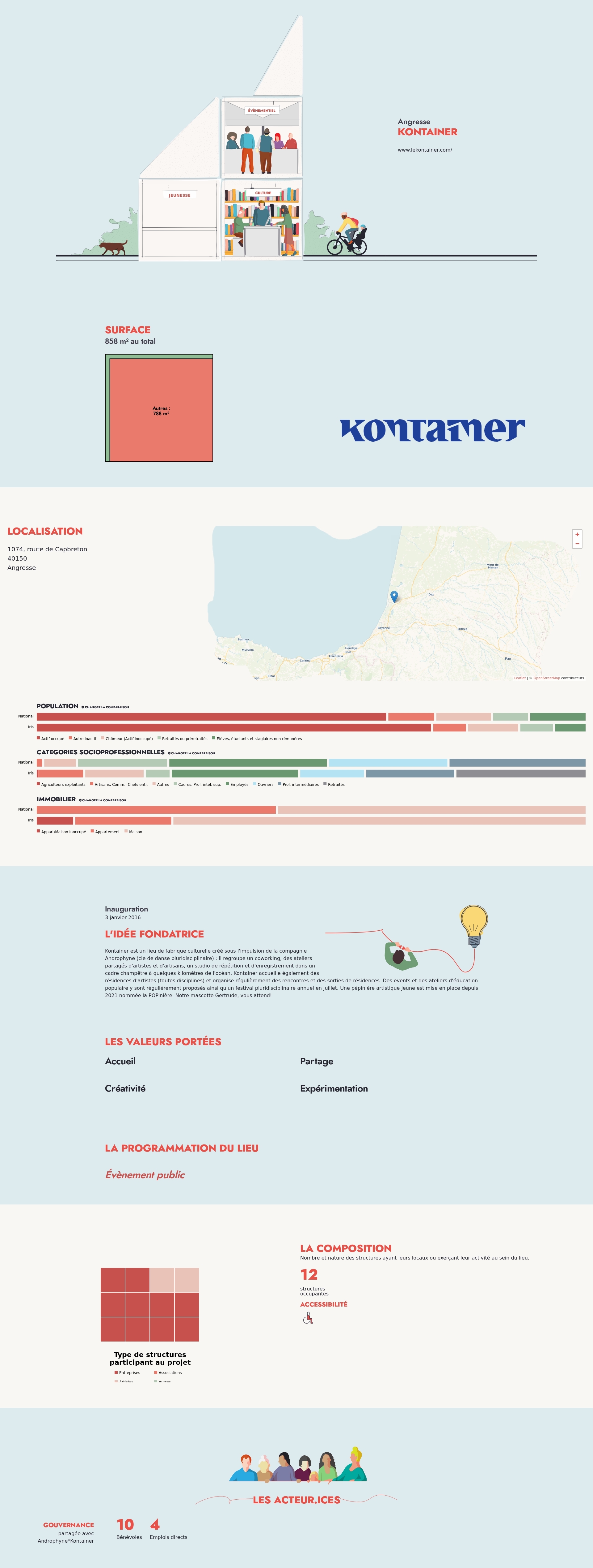 Kontainer est un lieu de fabrique culturelle créé sous l'impulsion de la compagnie Androphyne (cie de danse pluridisciplinaire) : il regroupe un coworking, des ateliers partagés d'artistes et d'artisans, un studio de répétition et d'enregistrement dans un cadre champêtre à quelques kilomètres de l'océan. Kontainer accueille également des résidences d'artistes (toutes disciplines) et organise régulièrement des rencontres et des sorties de résidences. Des events et des ateliers d'éducation populaire y sont régulièrement proposés ainsi qu'un festival pluridisciplinaire annuel en juillet. Une pépinière artistique jeune est mise en place depuis 2021 nommée la POPinière. Notre mascotte Gertrude, vous attend!