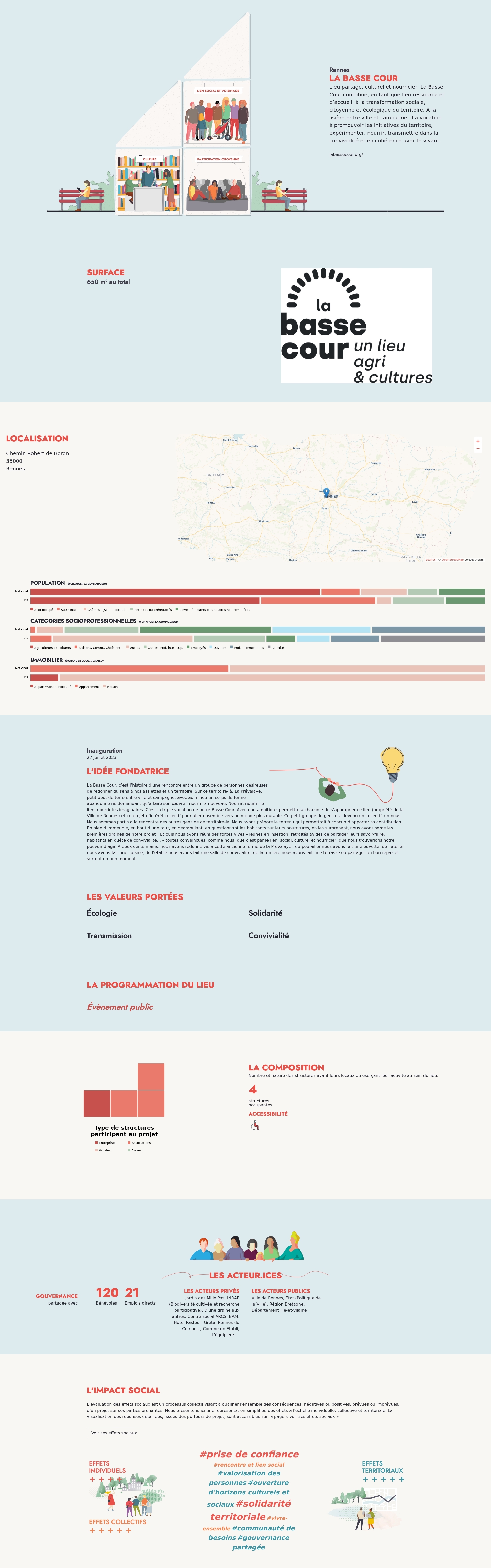 La Basse Cour, c’est l’histoire d’une rencontre entre un groupe de personnes désireuses de redonner du sens à nos assiettes et un territoire. Sur ce territoire-là, La Prévalaye, petit bout de terre entre ville et campagne, avec au milieu un corps de ferme abandonné ne demandant qu’à faire son œuvre : nourrir à nouveau. Nourrir, nourrir le lien, nourrir les imaginaires. C’est la triple vocation de notre Basse Cour. Avec une ambition : permettre à chacun.e de s’approprier ce lieu (propriété de la Ville de Rennes) et ce projet d’intérêt collectif pour aller ensemble vers un monde plus durable. Ce petit groupe de gens est devenu un collectif, un nous. Nous sommes partis à la rencontre des autres gens de ce territoire-là. Nous avons préparé le terreau qui permettrait à chacun d’apporter sa contribution. En pied d’immeuble, en haut d’une tour, en déambulant, en questionnant les habitants sur leurs nourritures, en les surprenant, nous avons semé les premières graines de notre projet ! Et puis nous avons réuni des forces vives – jeunes en insertion, retraités avides de partager leurs savoir-faire, habitants en quête de convivialité… – toutes convaincues, comme nous, que c’est par le lien, social, culturel et nourricier, que nous trouverions notre pouvoir d’agir. À deux cents mains, nous avons redonné vie à cette ancienne ferme de la Prévalaye : du poulailler nous avons fait une buvette, de l’atelier nous avons fait une cuisine, de l’étable nous avons fait une salle de convivialité, de la fumière nous avons fait une terrasse où partager un bon repas et surtout un bon moment.