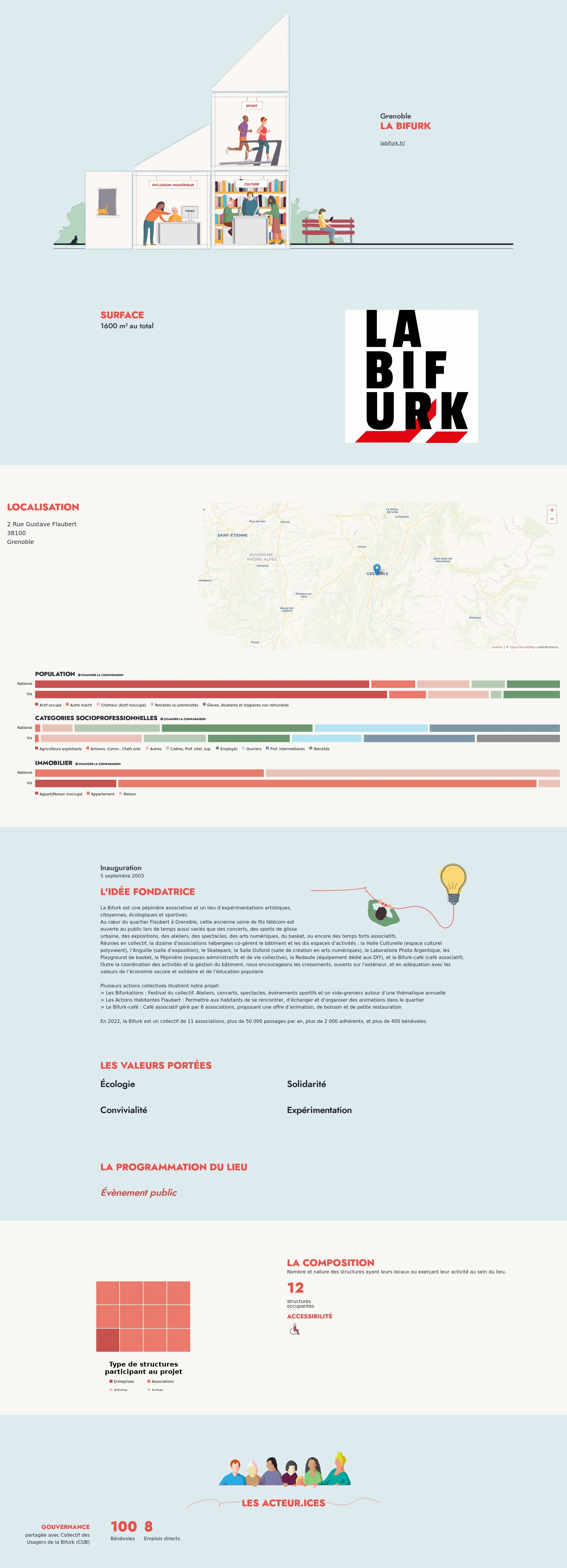 Réunies en collectif, la dizaine d'associations hébergées co-gèrent le bâtiment et les dix espaces d’activités : la Halle Culturelle (espace culturel polyvalent), l’Anguille (salle d’exposition), le Skatepark, la Salle Dufond (salle de création en arts numériques), le Laboratoire Photo Argentique, les Playground de basket, la Pépinière (espaces administratifs et de vie collective), la Redoute (équipement dédié aux DIY), et le Bifurk-café (café associatif).