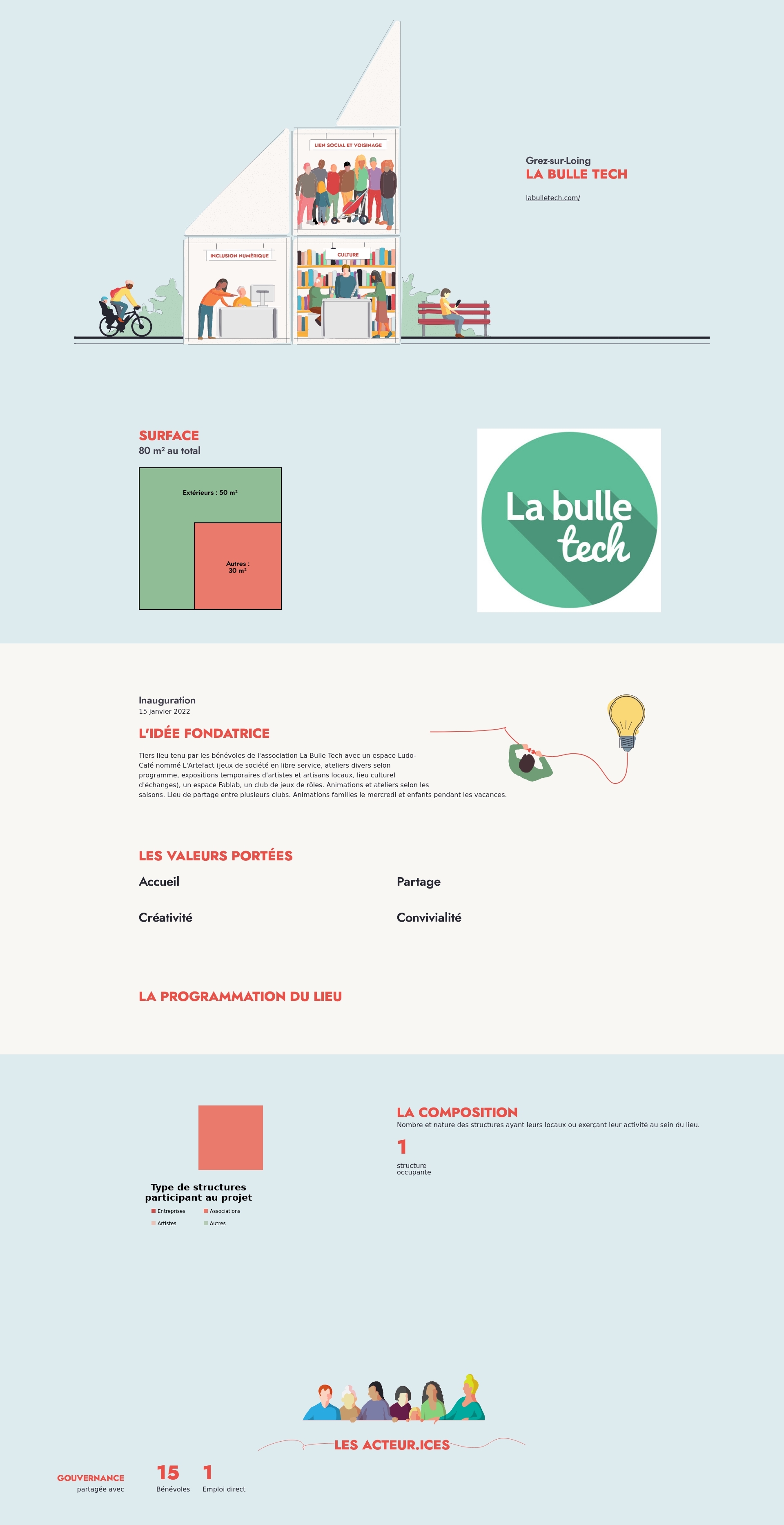 Tiers lieu tenu par les bénévoles de l'association La Bulle Tech avec un espace Ludo-Café nommé L'Artefact (jeux de société en libre service, ateliers divers selon programme, expositions temporaires d'artistes et artisans locaux, lieu culturel d'échanges), un espace Fablab, un club de jeux de rôles. Animations et ateliers selon les saisons. Lieu de partage entre plusieurs clubs. Animations familles le mercredi et enfants pendant les vacances.