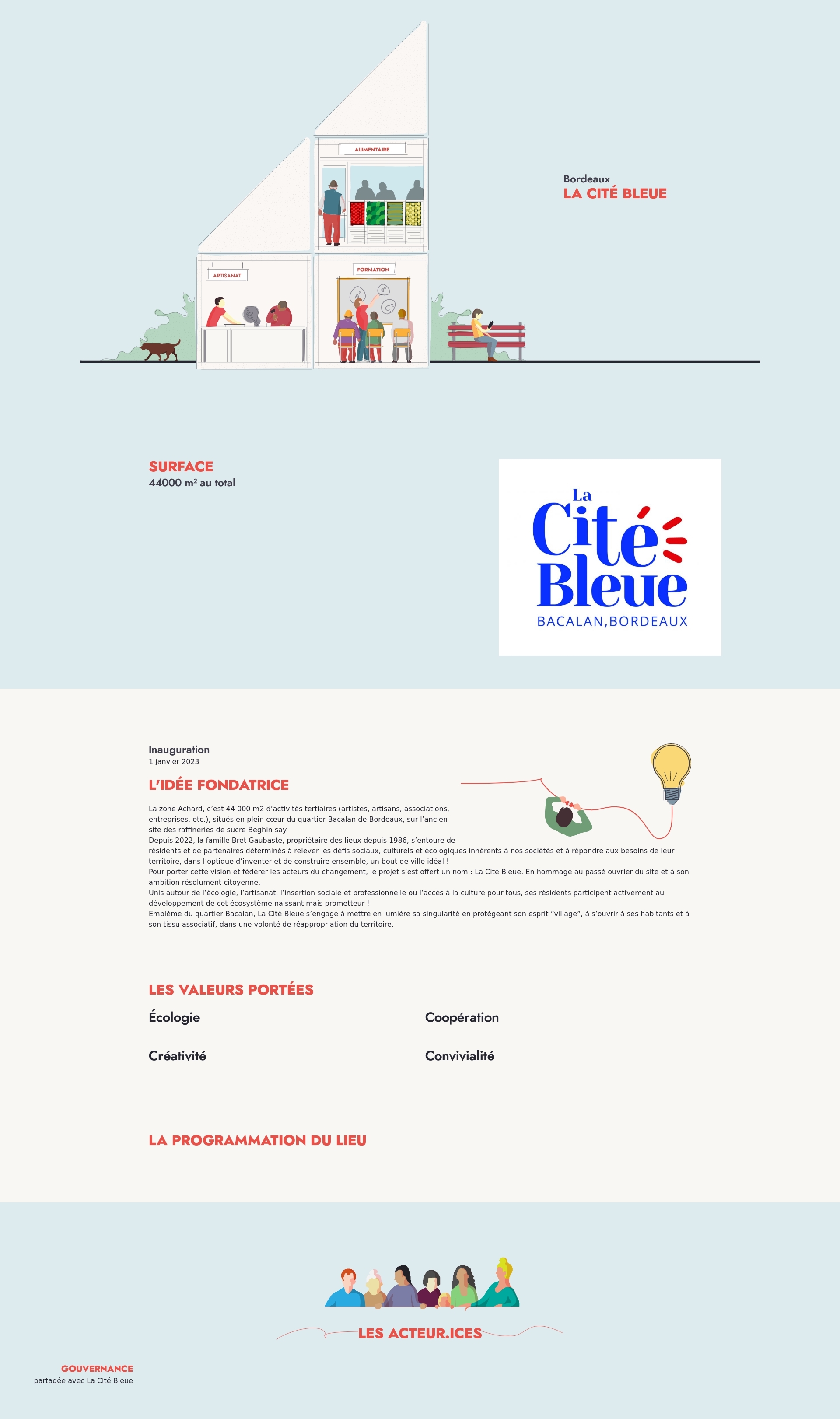 Emblème du quartier Bacalan, La Cité Bleue s’engage à mettre en lumière sa singularité en protégeant son esprit “village”, à s’ouvrir à ses habitants et à son tissu associatif, dans une volonté de réappropriation du territoire.
