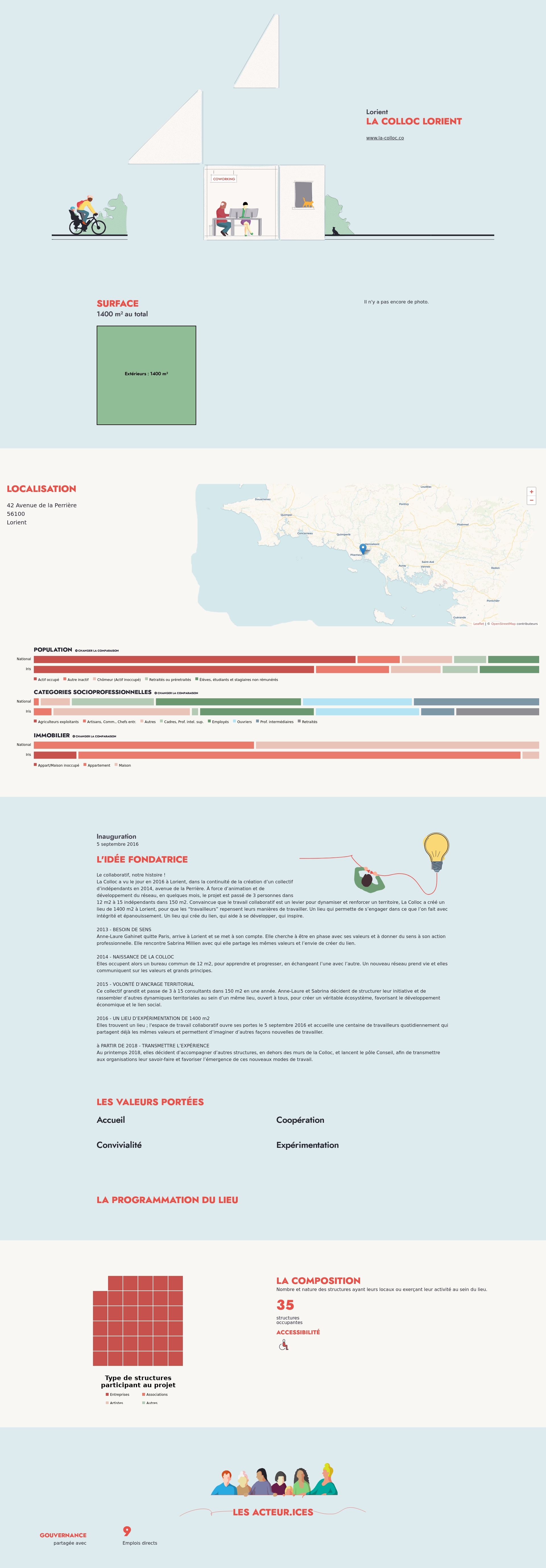 La Colloc a vu le jour en 2016 à Lorient, dans la continuité de la création d’un collectif d’indépendants en 2014, avenue de la Perrière. À force d’animation et de développement du réseau, en quelques mois, le projet est passé de 3 personnes dans 12 m2 à 15 indépendants dans 150 m2. Convaincue que le travail collaboratif est un levier pour dynamiser et renforcer un territoire, La Colloc a créé un lieu de 1400 m2 à Lorient, pour que les “travailleurs” repensent leurs manières de travailler. Un lieu qui permette de s’engager dans ce que l’on fait avec intégrité et épanouissement. Un lieu qui crée du lien, qui aide à se développer, qui inspire.