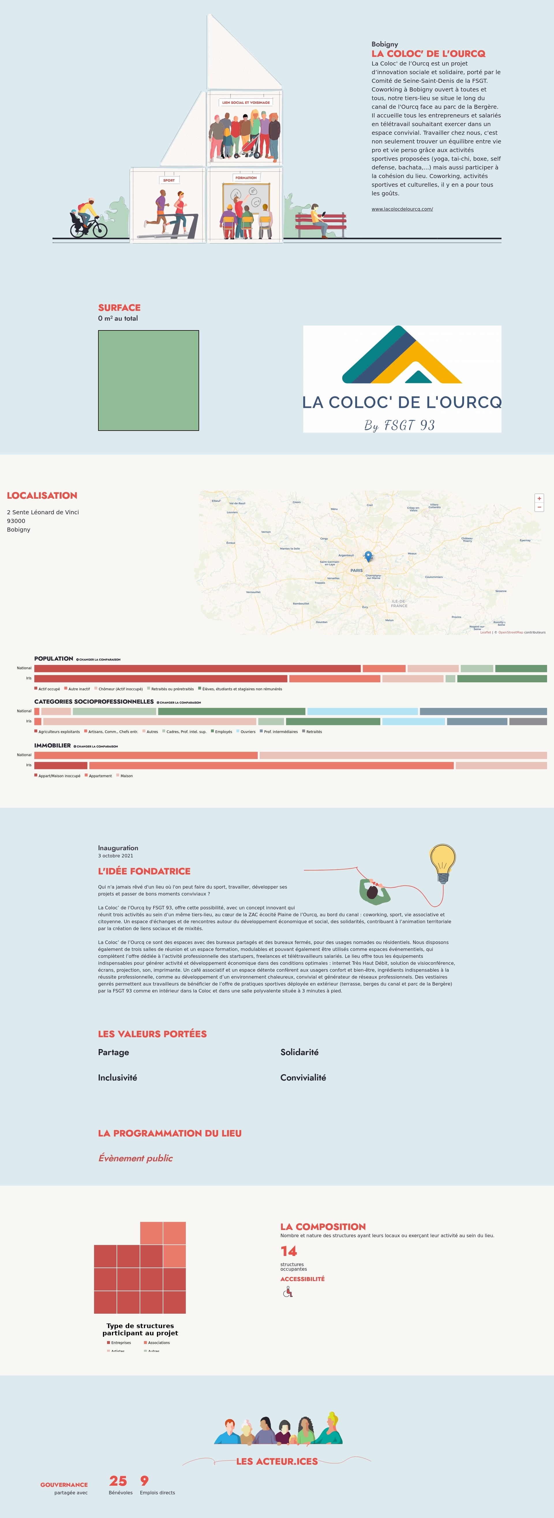 La Coloc’ de l'Ourcq by FSGT 93, offre cette possibilité, avec un concept innovant qui réunit trois activités au sein d’un même tiers-lieu, au cœur de la ZAC écocité Plaine de l’Ourcq, au bord du canal : coworking, sport, vie associative et citoyenne. Un espace d'échanges et de rencontres autour du développement économique et social, des solidarités, contribuant à l’animation territoriale par la création de liens sociaux et de mixités.