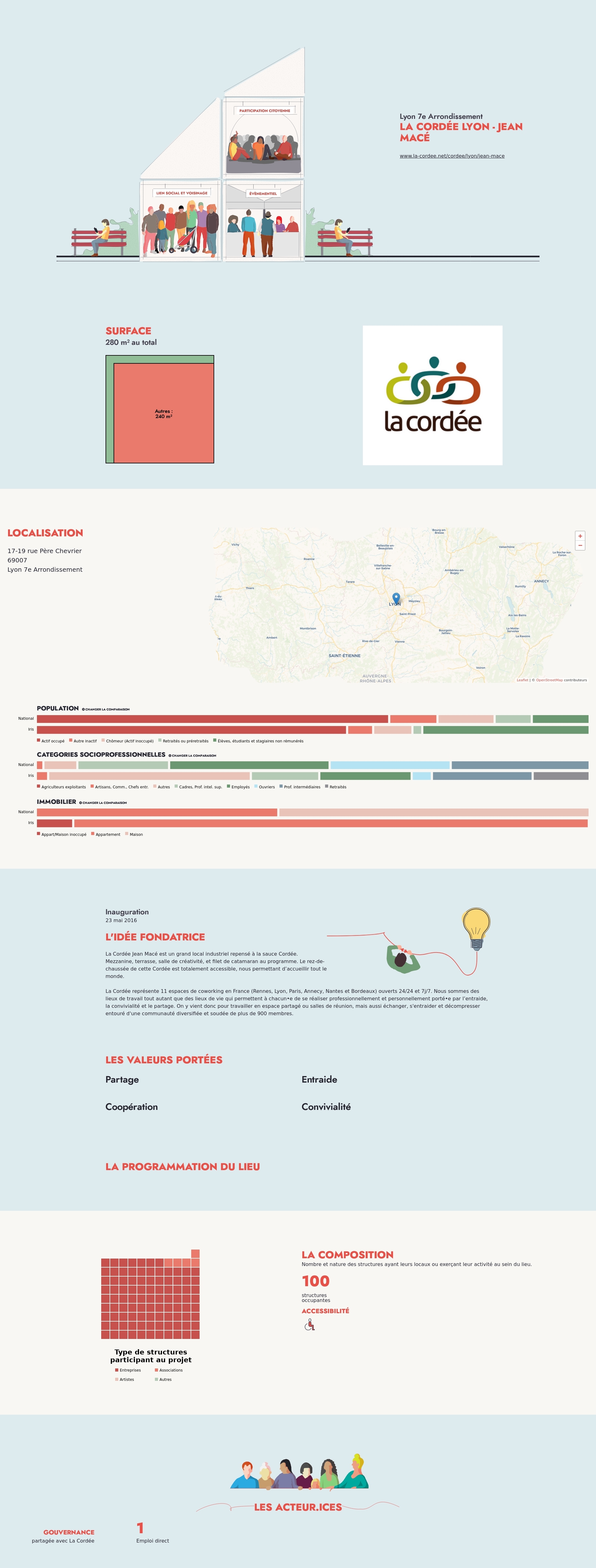 La Cordée représente 11 espaces de coworking en France (Rennes, Lyon, Paris, Annecy, Nantes et Bordeaux) ouverts 24/24 et 7j/7. Nous sommes des lieux de travail tout autant que des lieux de vie qui permettent à chacun•e de se réaliser professionnellement et personnellement porté•e par l’entraide, la convivialité et le partage. On y vient donc pour travailler en espace partagé ou salles de réunion, mais aussi échanger, s'entraider et décompresser entouré d'une communauté diversifiée et soudée de plus de 900 membres.