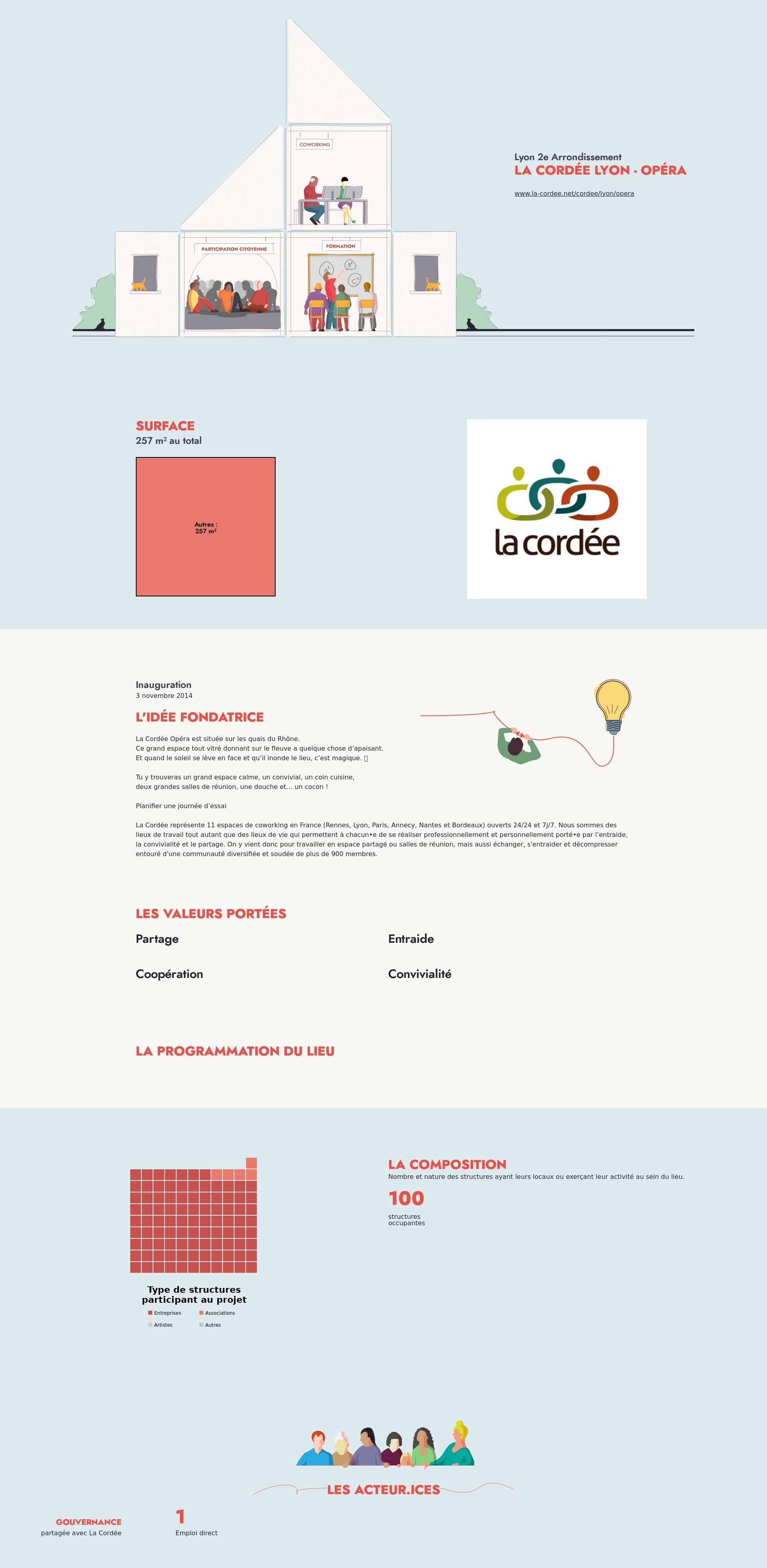 La Cordée représente 11 espaces de coworking en France (Rennes, Lyon, Paris, Annecy, Nantes et Bordeaux) ouverts 24/24 et 7j/7. Nous sommes des lieux de travail tout autant que des lieux de vie qui permettent à chacun•e de se réaliser professionnellement et personnellement porté•e par l’entraide, la convivialité et le partage. On y vient donc pour travailler en espace partagé ou salles de réunion, mais aussi échanger, s'entraider et décompresser entouré d'une communauté diversifiée et soudée de plus de 900 membres.