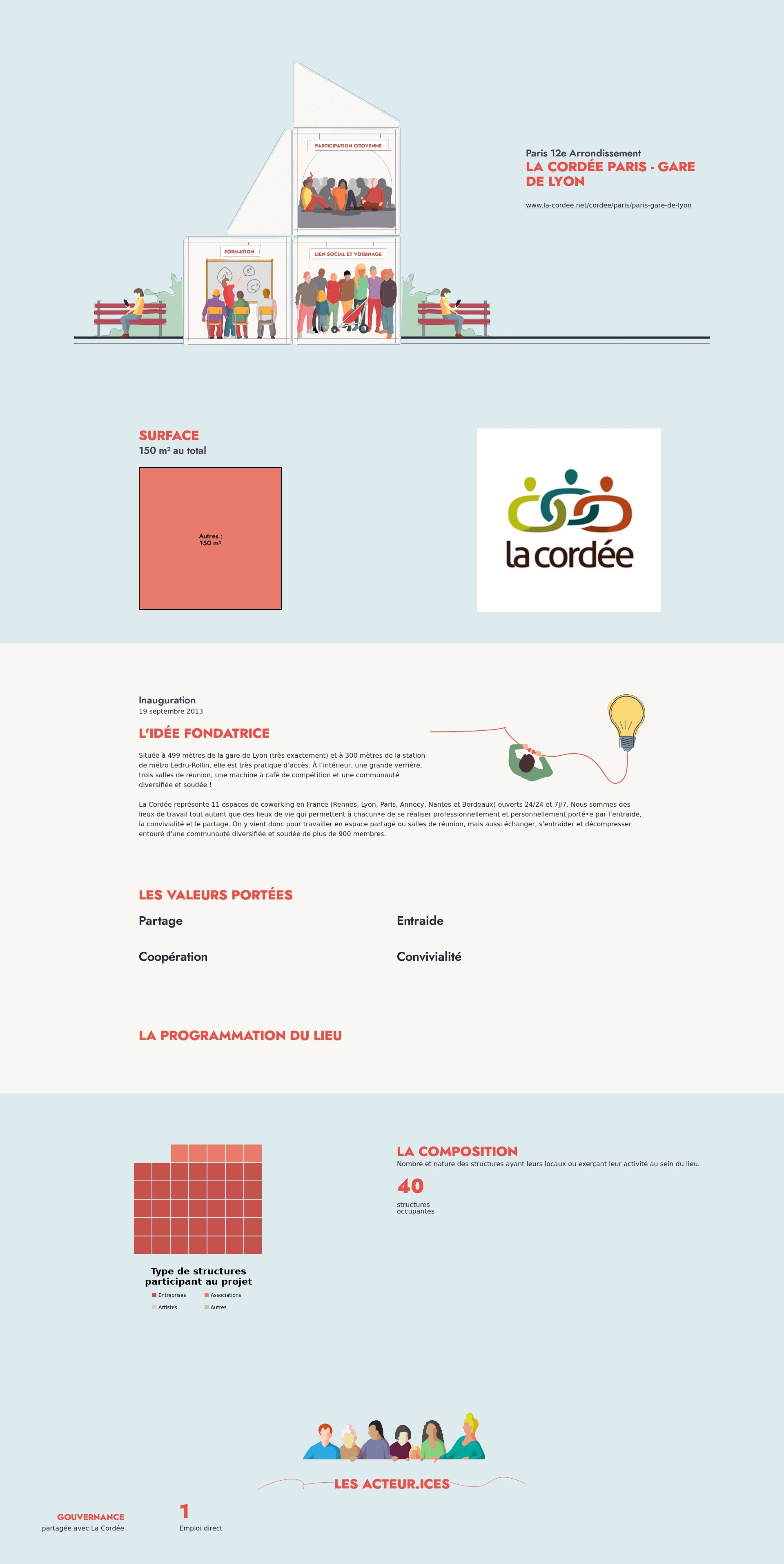 La Cordée représente 11 espaces de coworking en France (Rennes, Lyon, Paris, Annecy, Nantes et Bordeaux) ouverts 24/24 et 7j/7. Nous sommes des lieux de travail tout autant que des lieux de vie qui permettent à chacun•e de se réaliser professionnellement et personnellement porté•e par l’entraide, la convivialité et le partage. On y vient donc pour travailler en espace partagé ou salles de réunion, mais aussi échanger, s'entraider et décompresser entouré d'une communauté diversifiée et soudée de plus de 900 membres.