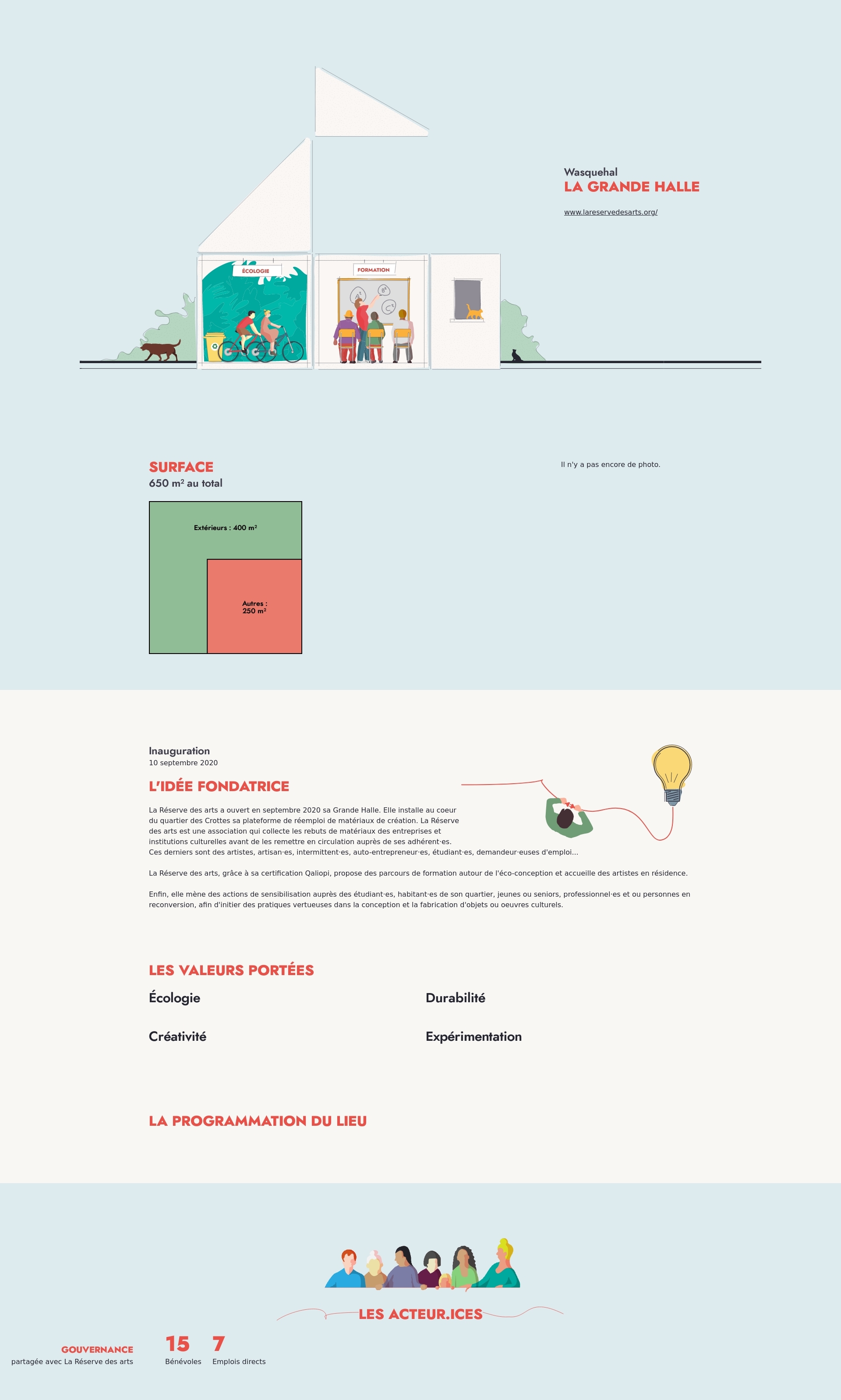 La Réserve des arts a ouvert en septembre 2020 sa Grande Halle. Elle installe au coeur du quartier des Crottes sa plateforme de réemploi de matériaux de création. La Réserve des arts est une association qui collecte les rebuts de matériaux des entreprises et institutions culturelles avant de les remettre en circulation auprès de ses adhérent·es. Ces derniers sont des artistes, artisan·es, intermittent·es, auto-entrepreneur·es, étudiant·es, demandeur·euses d'emploi...