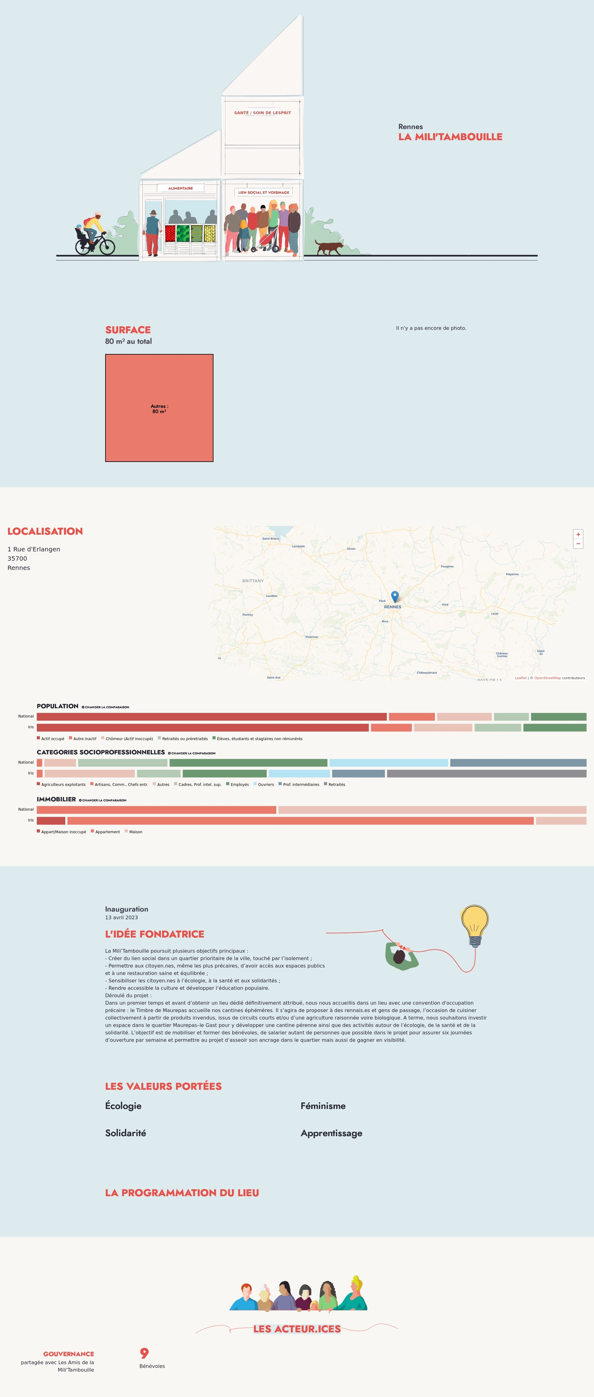 Dans un premier temps et avant d’obtenir un lieu dédié définitivement attribué, nous nous accueillis dans un lieu avec une convention d'occupation précaire : le Timbre de Maurepas accueille nos cantines éphémères. Il s’agira de proposer à des rennais.es et gens de passage, l’occasion de cuisiner collectivement à partir de produits invendus, issus de circuits courts et/ou d’une agriculture raisonnée voire biologique. A terme, nous souhaitons investir un espace dans le quartier Maurepas–le Gast pour y développer une cantine pérenne ainsi que des activités autour de l’écologie, de la santé et de la solidarité. L’objectif est de mobiliser et former des bénévoles, de salarier autant de personnes que possible dans le projet pour assurer six journées d’ouverture par semaine et permettre au projet d’asseoir son ancrage dans le quartier mais aussi de gagner en visibilité.