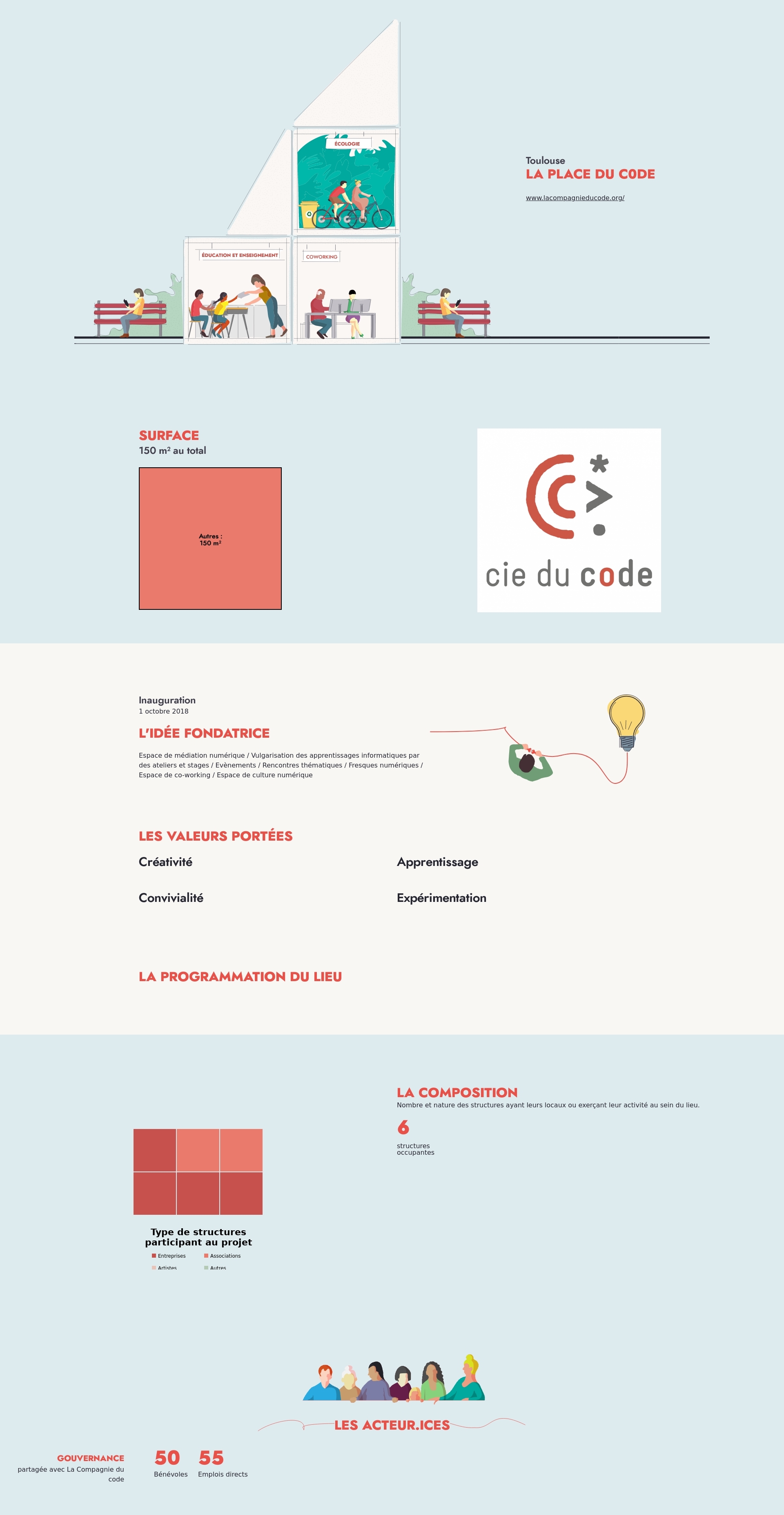 Espace de médiation numérique / Vulgarisation des apprentissages informatiques par des ateliers et stages / Evènements / Rencontres thématiques / Fresques numériques / Espace de co-working / Espace de culture numérique