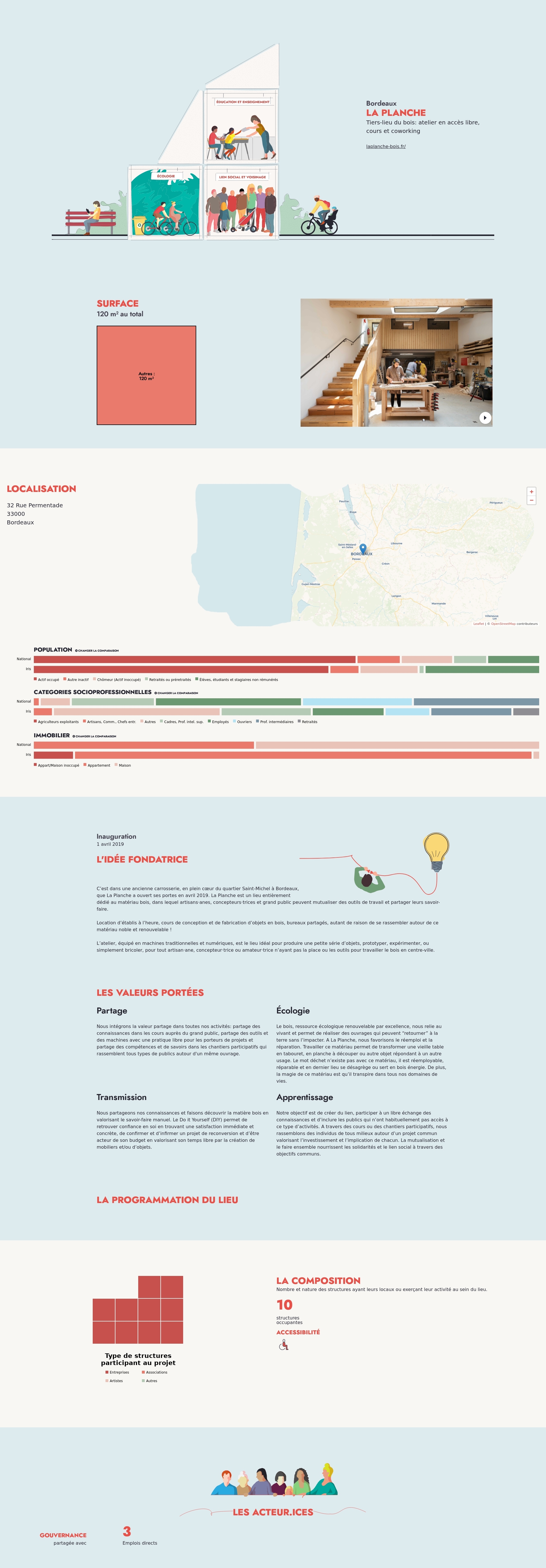 C’est dans une ancienne carrosserie, en plein cœur du quartier Saint-Michel à Bordeaux, que La Planche a ouvert ses portes en avril 2019. La Planche est un lieu entièrement dédié au matériau bois, dans lequel artisans·anes, concepteurs·trices et grand public peuvent mutualiser des outils de travail et partager leurs savoir-faire.