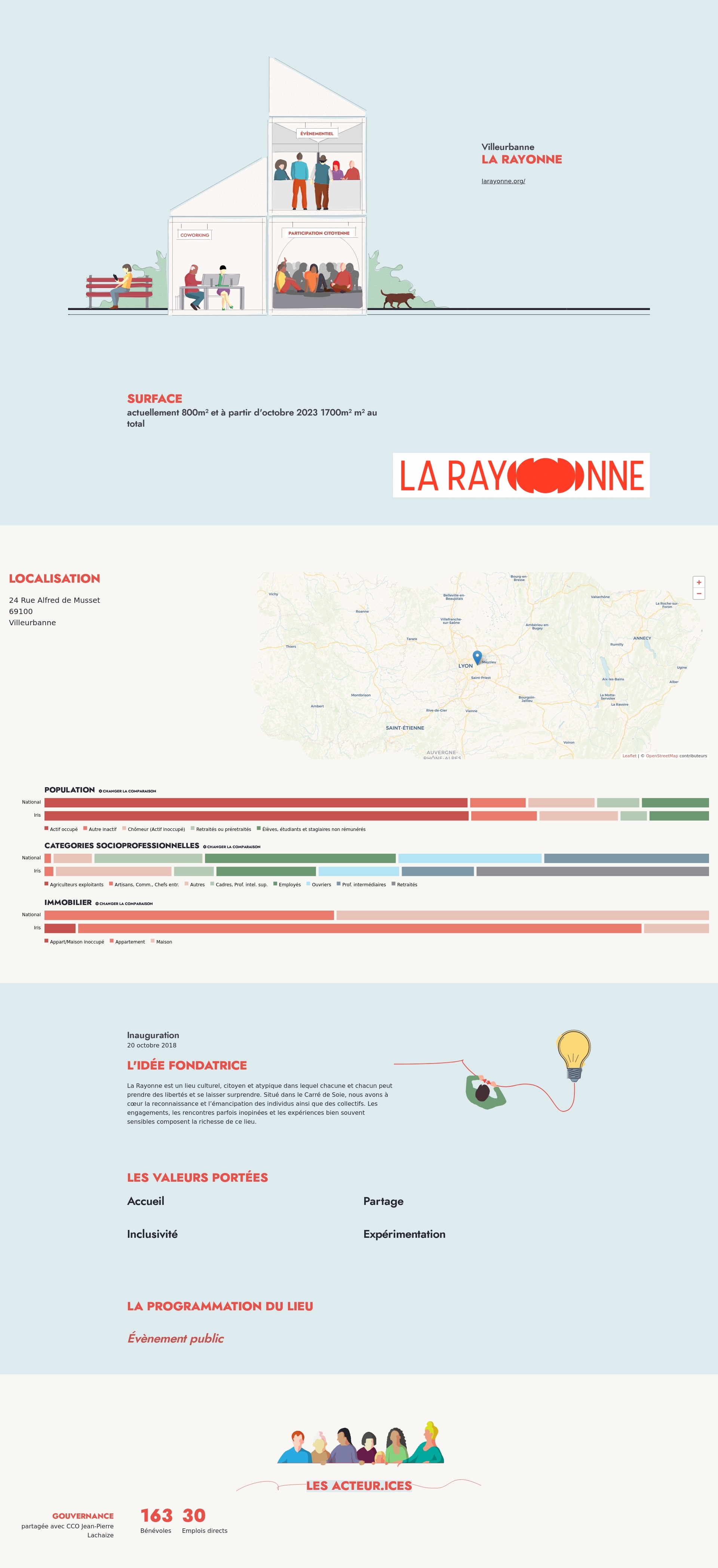 La Rayonne est un lieu culturel, citoyen et atypique dans lequel chacune et chacun peut prendre des libertés et se laisser surprendre. Situé dans le Carré de Soie, nous avons à cœur la reconnaissance et l’émancipation des individus ainsi que des collectifs. Les engagements, les rencontres parfois inopinées et les expériences bien souvent sensibles composent la richesse de ce lieu.