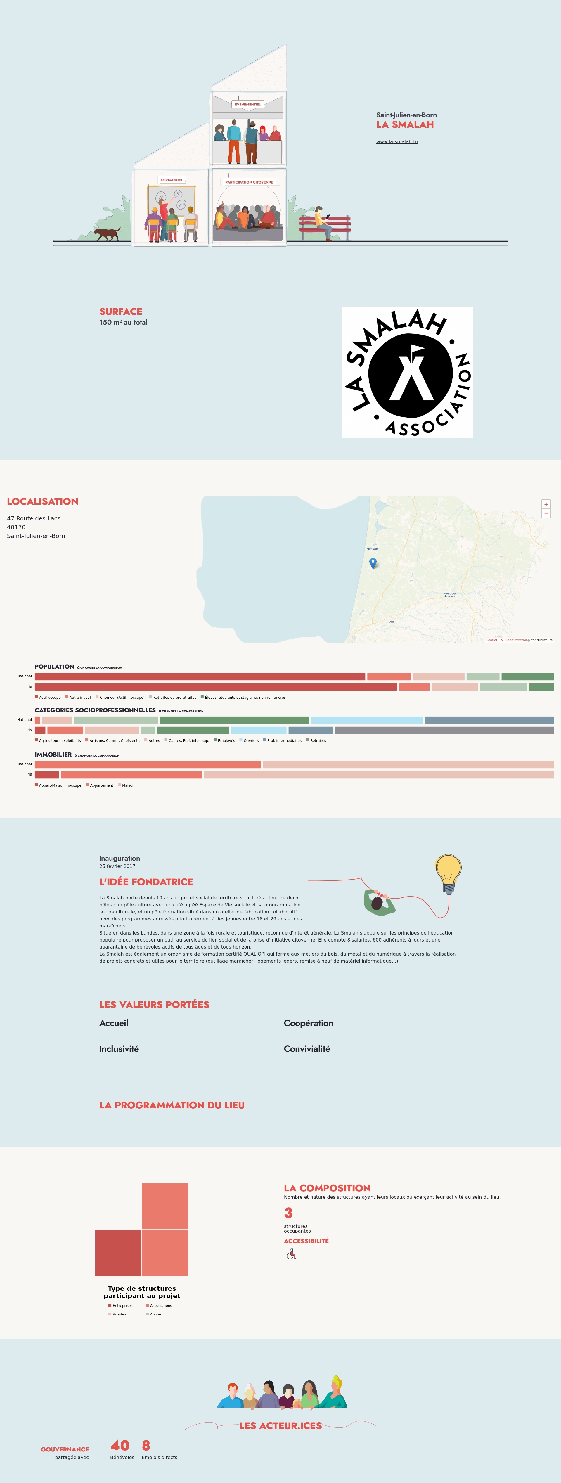 Situé en dans les Landes, dans une zone à la fois rurale et touristique, reconnue d'intérêt générale, La Smalah s'appuie sur les principes de l'éducation populaire pour proposer un outil au service du lien social et de la prise d'initiative citoyenne. Elle compte 8 salariés, 600 adhérents à jours et une quarantaine de bénévoles actifs de tous âges et de tous horizon.
