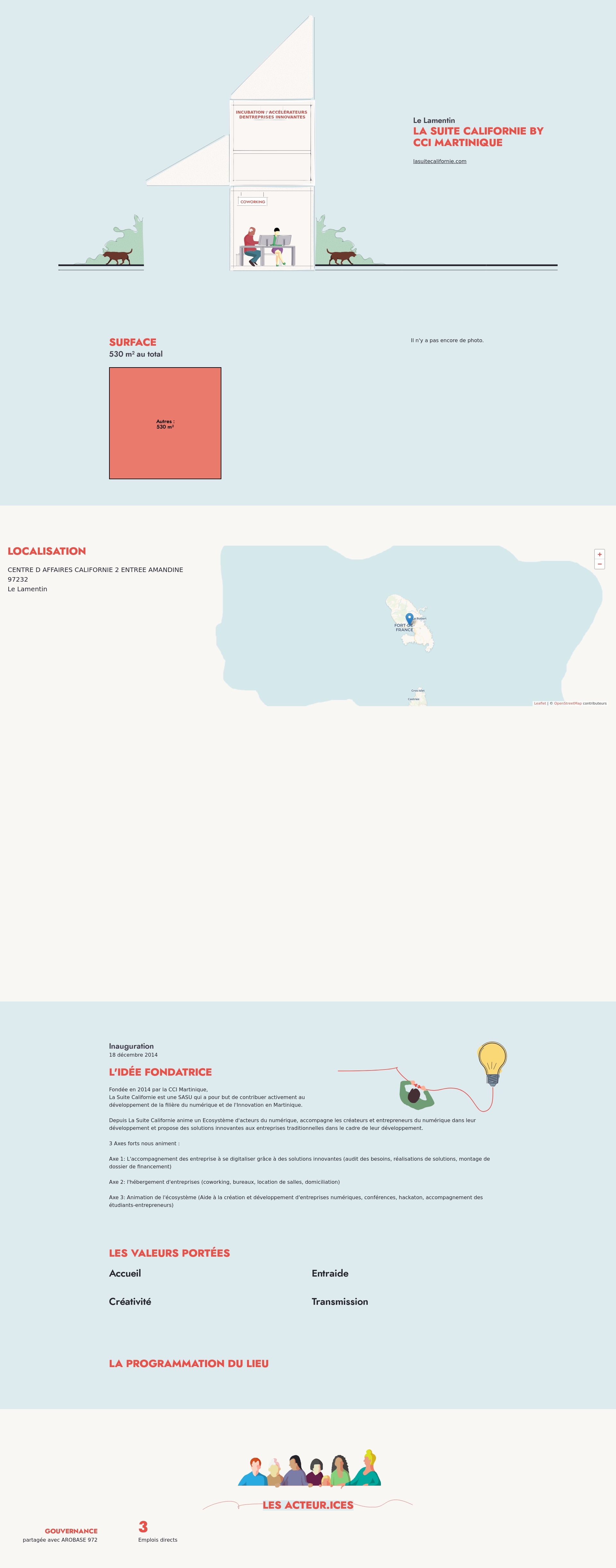La Suite Californie est une SASU qui a pour but de contribuer activement au développement de la filière du numérique et de l'Innovation en Martinique.
