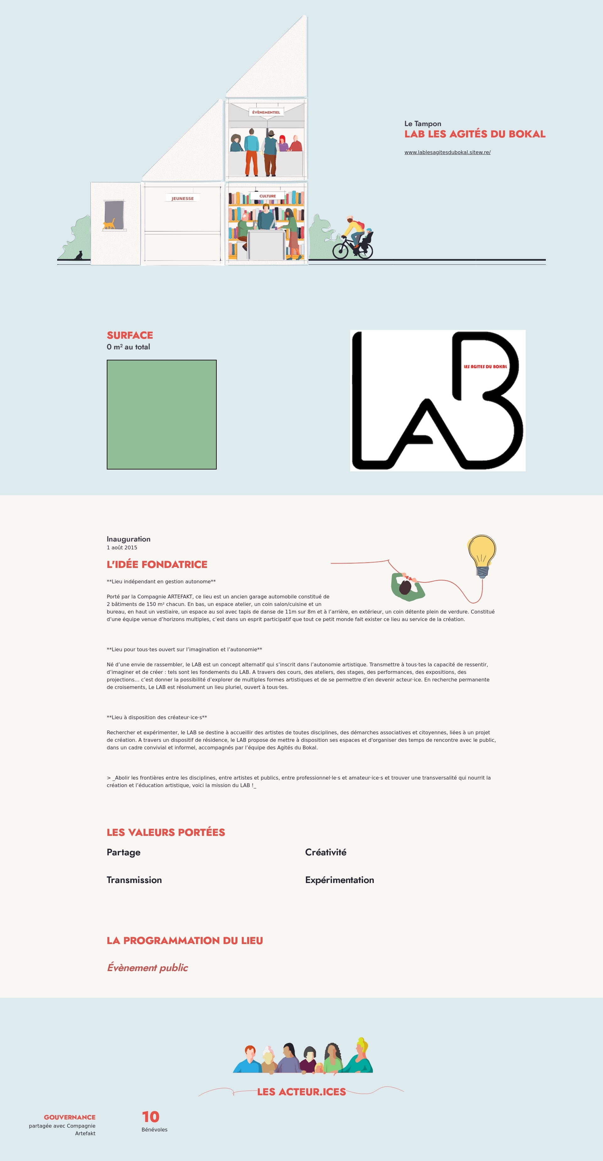 Rechercher et expérimenter, le LAB se destine à accueillir des artistes de toutes disciplines, des démarches associatives et citoyennes, liées à un projet de création. A travers un dispositif de résidence, le LAB propose de mettre à disposition ses espaces et d'organiser des temps de rencontre avec le public, dans un cadre convivial et informel, accompagnés par l’équipe des Agités du Bokal.