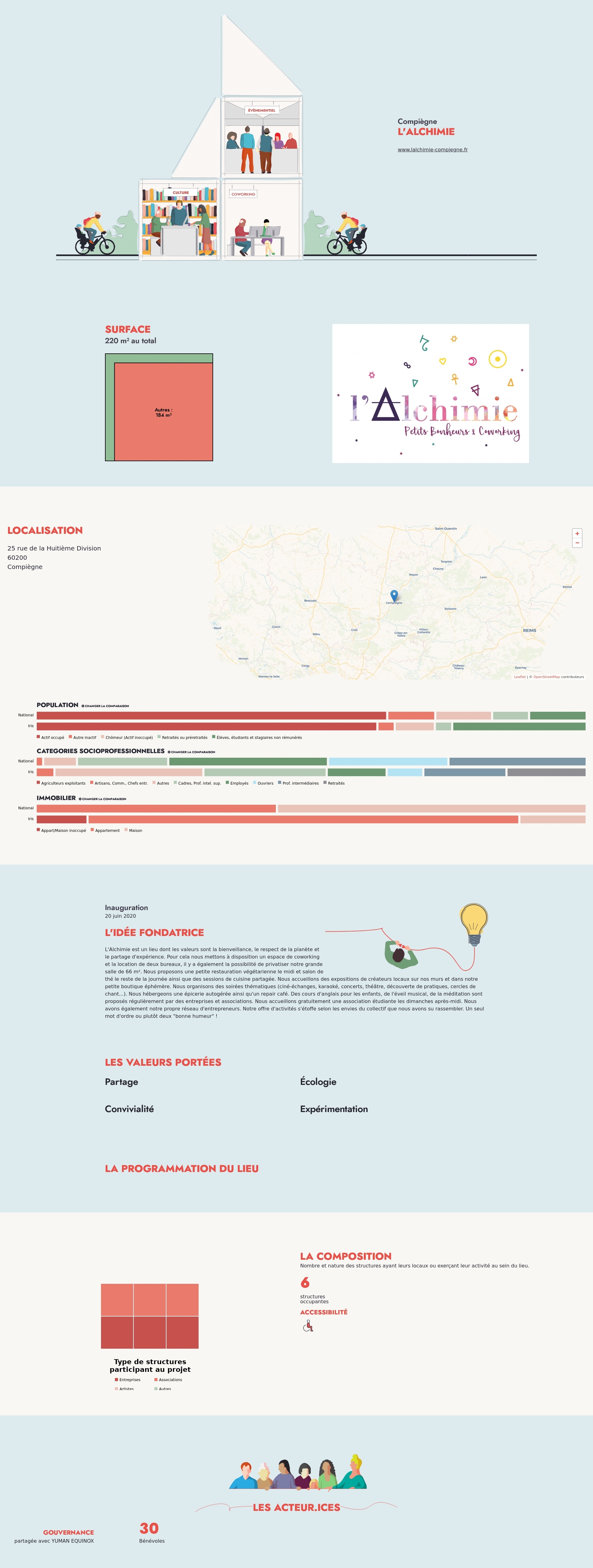 L'Alchimie est un lieu dont les valeurs sont la bienveillance, le respect de la planète et le partage d'expérience. Pour cela nous mettons à disposition un espace de coworking et la location de deux bureaux, il y a également la possibilité de privatiser notre grande salle de 66 m². Nous proposons une petite restauration végétarienne le midi et salon de thé le reste de la journée ainsi que des sessions de cuisine partagée. Nous accueillons des expositions de créateurs locaux sur nos murs et dans notre petite boutique éphémère. Nous organisons des soirées thématiques (ciné-échanges, karaoké, concerts, théâtre, découverte de pratiques, cercles de chant...). Nous hébergeons une épicerie autogérée ainsi qu'un repair café. Des cours d'anglais pour les enfants, de l'éveil musical, de la méditation sont proposés régulièrement par des entreprises et associations. Nous accueillons gratuitement une association étudiante les dimanches après-midi. Nous avons également notre propre réseau d'entrepreneurs. Notre offre d'activités s'étoffe selon les envies du collectif que nous avons su rassembler. Un seul mot d'ordre ou plutôt deux "bonne humeur" !