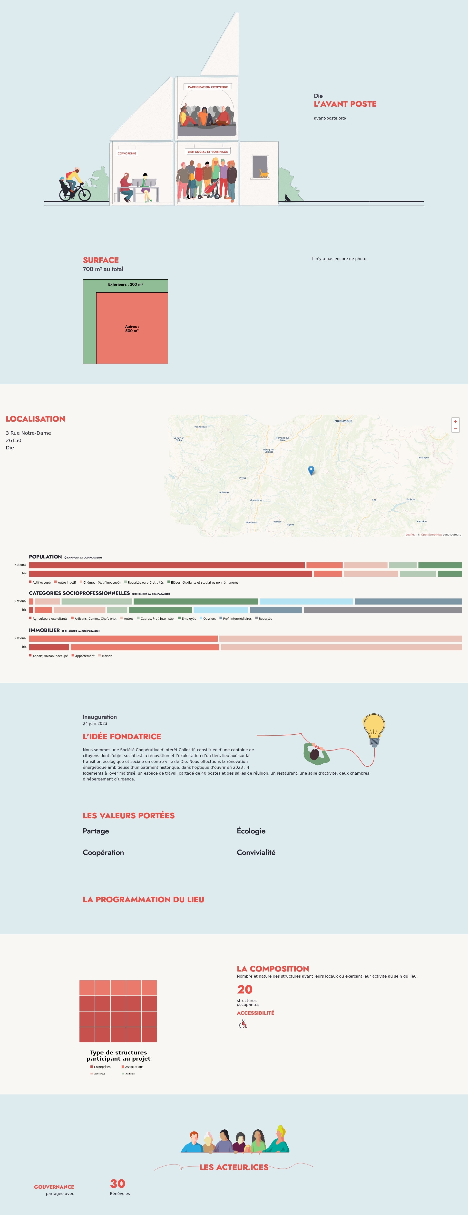 Nous sommes une Société Coopérative d’Intérêt Collectif, constituée d’une centaine de citoyens dont l’objet social est la rénovation et l’exploitation d’un tiers-lieu axé sur la transition écologique et sociale en centre-ville de Die. Nous effectuons la rénovation énergétique ambitieuse d’un bâtiment historique, dans l’optique d’ouvrir en 2023 : 4 logements à loyer maîtrisé, un espace de travail partagé de 40 postes et des salles de réunion, un restaurant, une salle d’activité, deux chambres d’hébergement d’urgence.
