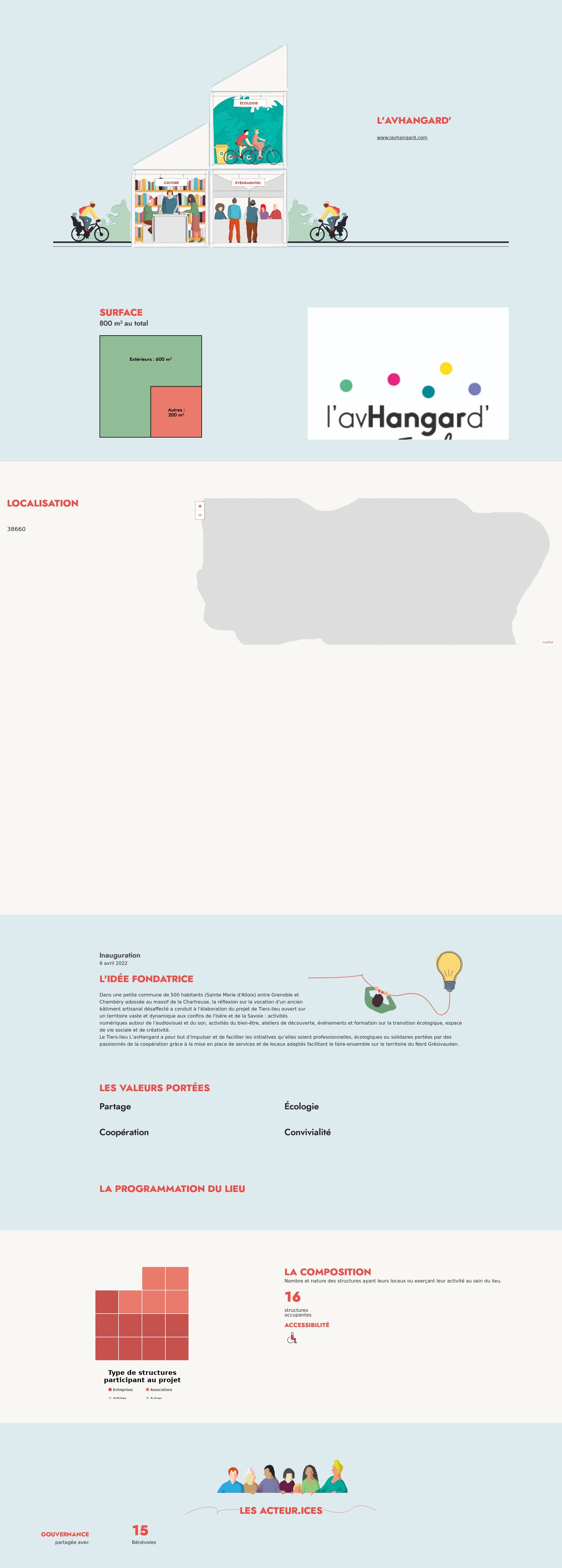 Installé dans un ancien hangard industriel de 500 m2, l'avHangard' est un espace en évolution co-construit pour et avec les habitants du territoire. Il accueille actuellement de nombreux évènements et animations, une salle de spectacle/projection de 120 places, une boutique éphémère, un studio d'enregistrement (vidéo, podcast, musique), un fablab. A terme il proposera un espace de coworking, de la locations de salles et des espaces pour les activités de bien-être.