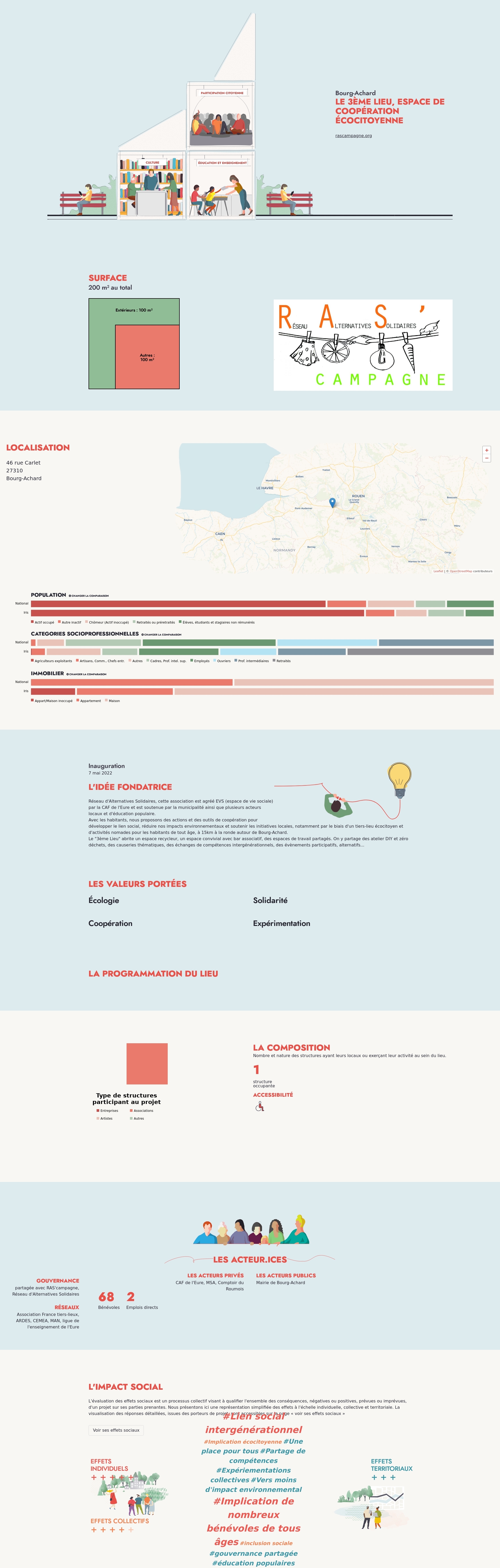 Avec les habitants, nous proposons des actions et des outils de coopération pour développer le lien social, réduire nos impacts environnementaux et soutenir les initiatives locales, notamment par le biais d'un tiers-lieu écocitoyen et d'activités nomades pour les habitants de tout âge, à 15km à la ronde autour de Bourg-Achard.