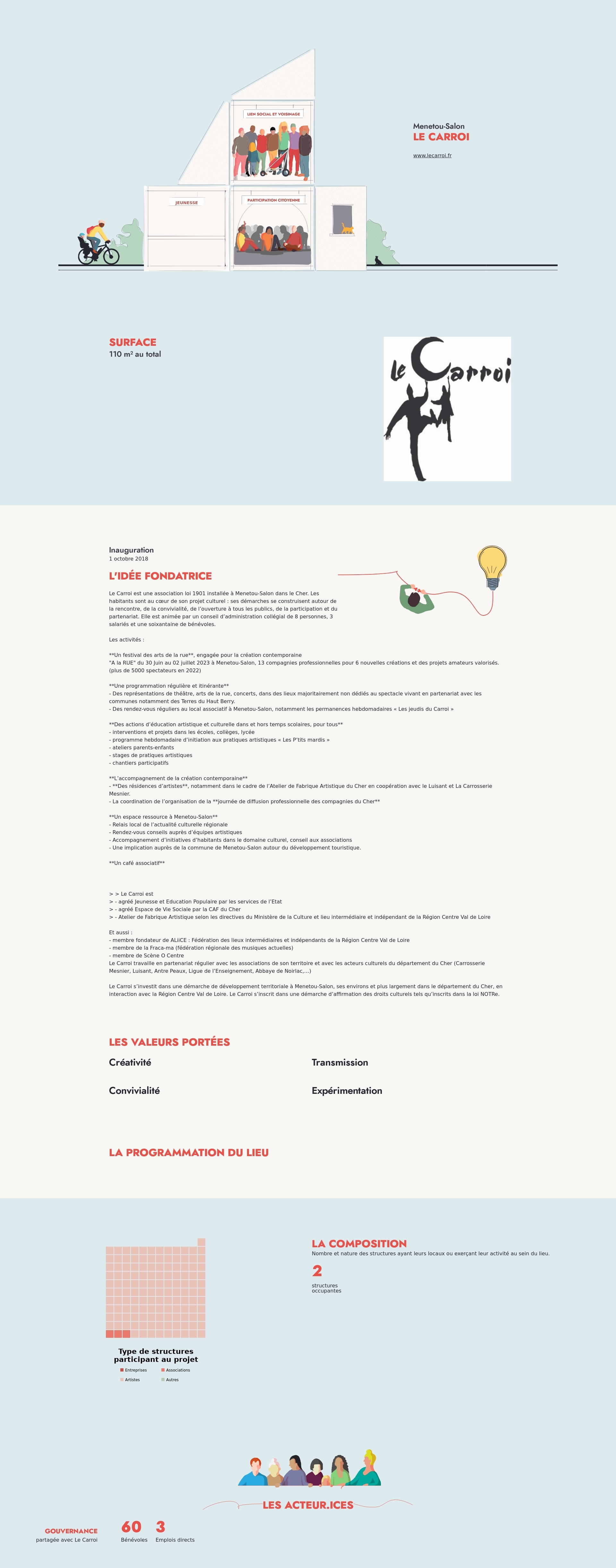 Le Carroi est une association loi 1901 installée à Menetou-Salon dans le Cher. Les habitants sont au cœur de son projet culturel : ses démarches se construisent autour de la rencontre, de la convivialité, de l’ouverture à tous les publics, de la participation et du partenariat. Elle est animée par un conseil d’administration collégial de 8 personnes, 3 salariés et une soixantaine de bénévoles.