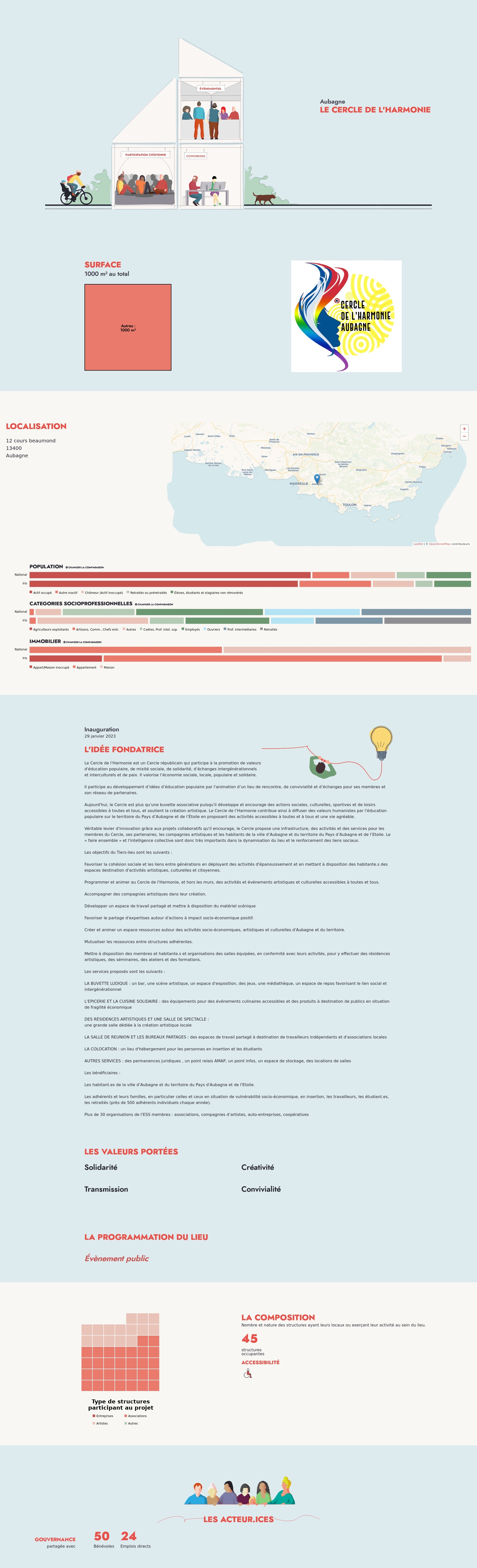 Véritable levier d'innovation grâce aux projets collaboratifs qu'il encourage, le Cercle propose une infrastructure, des activités et des services pour les membres du Cercle, ses partenaires, les compagnies artistiques et les habitants de la ville d’Aubagne et du territoire du Pays d’Aubagne et de l’Etoile. Le « faire ensemble » et l'intelligence collective sont donc très importants dans la dynamisation du lieu et le renforcement des liens sociaux.