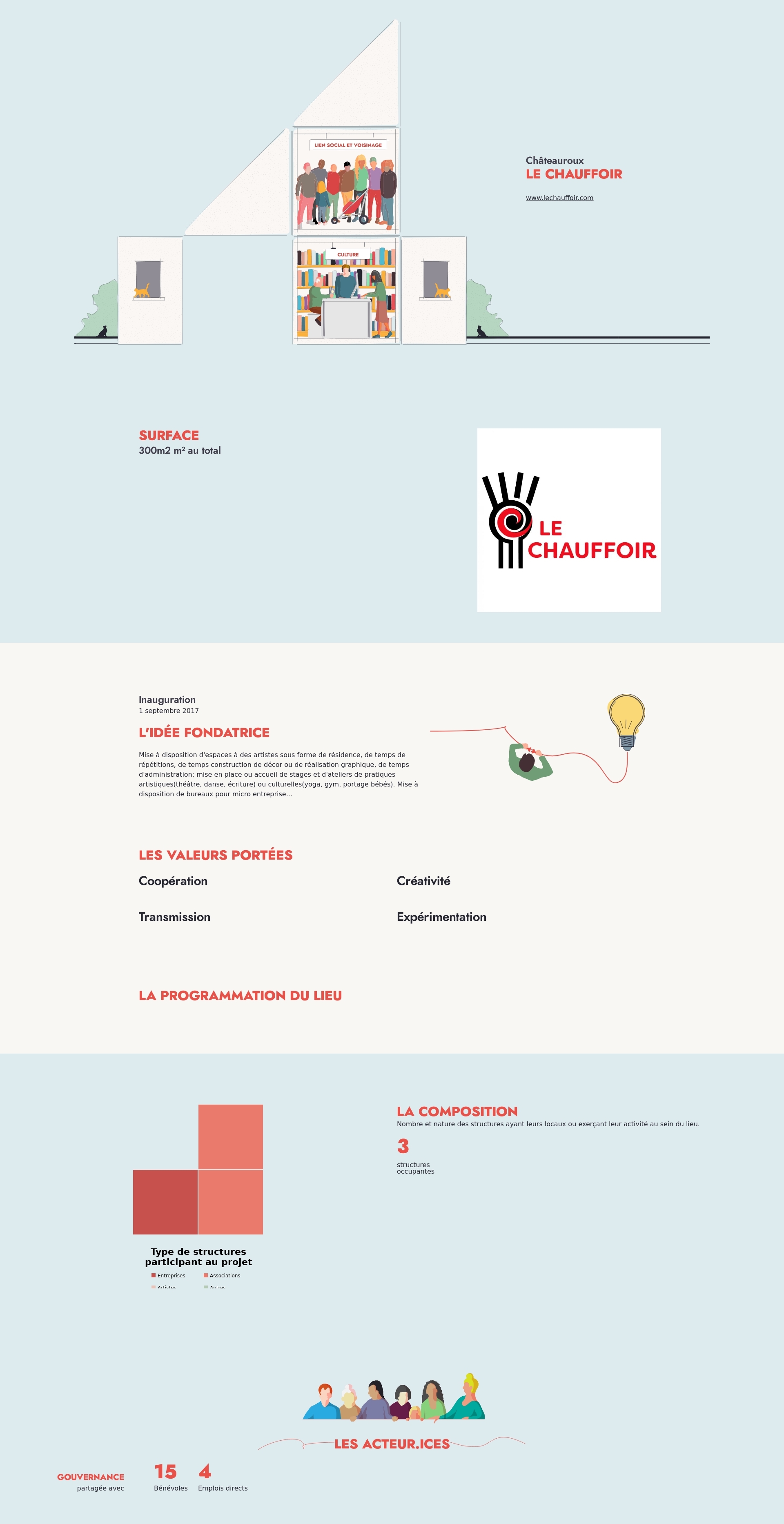 Mise à disposition d'espaces à des artistes sous forme de résidence, de temps de répétitions, de temps construction de décor ou de réalisation graphique, de temps d'administration; mise en place ou accueil de stages et d'ateliers de pratiques artistiques(théâtre, danse, écriture) ou culturelles(yoga, gym, portage bébés). Mise à disposition de bureaux pour micro entreprise...