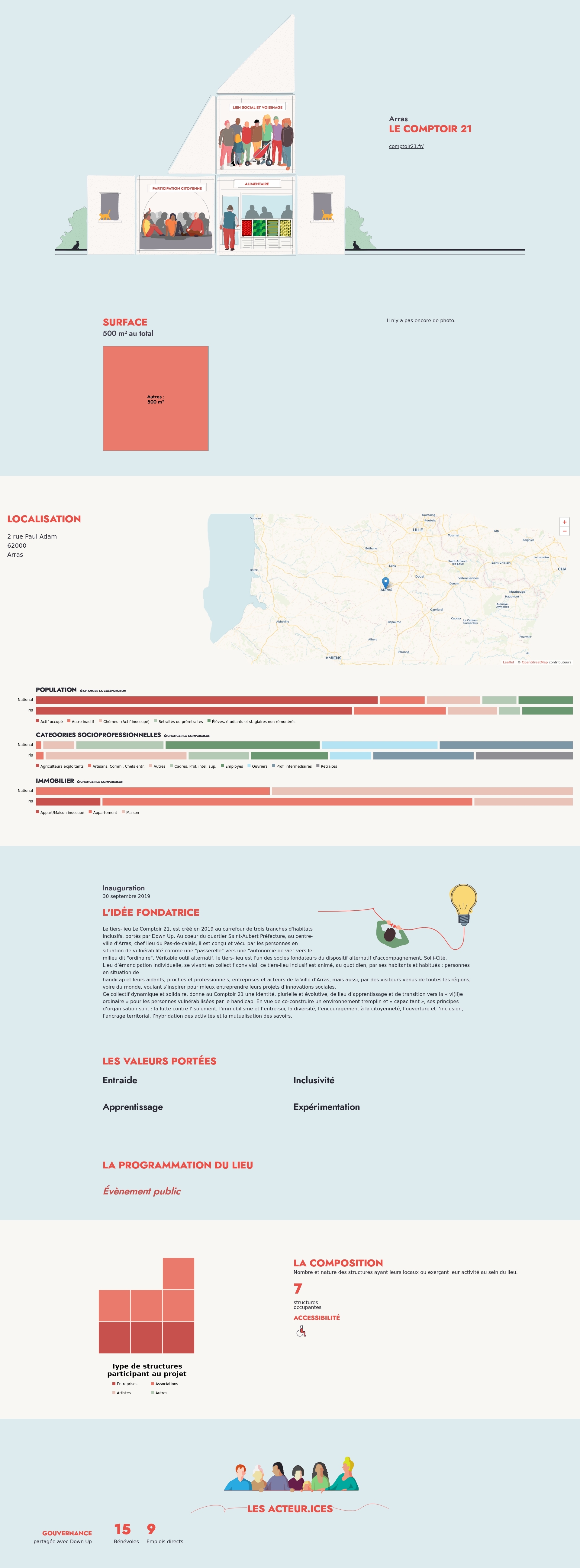 Le tiers-lieu Le Comptoir 21, est créé en 2019 au carrefour de trois tranches d'habitats inclusifs, portés par Down Up. Au coeur du quartier Saint-Aubert Préfecture, au centre-ville d'Arras, chef lieu du Pas-de-calais, il est conçu et vécu par les personnes en situation de vulnérabilité comme une "passerelle" vers une "autonomie de vie" vers le milieu dit "ordinaire". Véritable outil alternatif, le tiers-lieu est l'un des socles fondateurs du dispositif alternatif d'accompagnement, Solli-Cité.