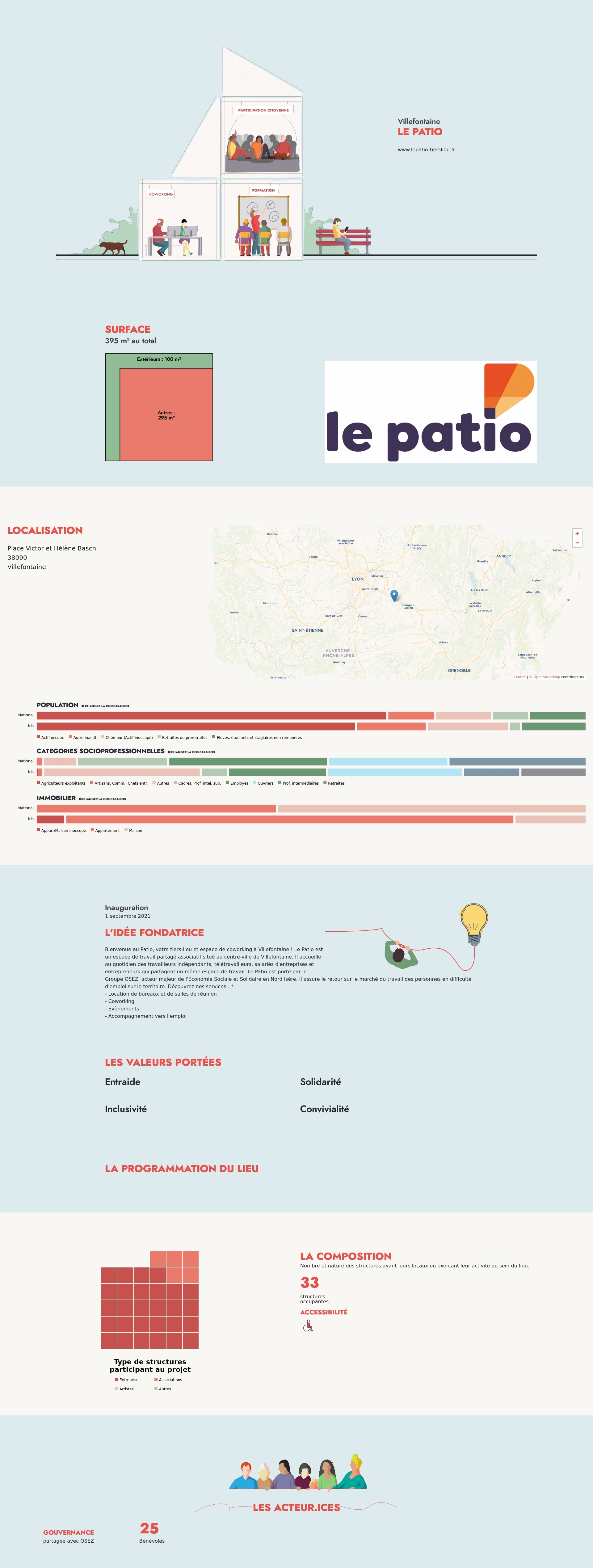 Bienvenue au Patio, votre tiers-lieu et espace de coworking à Villefontaine ! Le Patio est un espace de travail partagé associatif situé au centre-ville de Villefontaine. Il accueille au quotidien des travailleurs indépendants, télétravailleurs, salariés d'entreprises et entrepreneurs qui partagent un même espace de travail. Le Patio est porté par le Groupe OSEZ, acteur majeur de l'Economie Sociale et Solidaire en Nord Isère. Il assure le retour sur le marché du travail des personnes en difficulté d'emploi sur le territoire. Découvrez nos services : *
