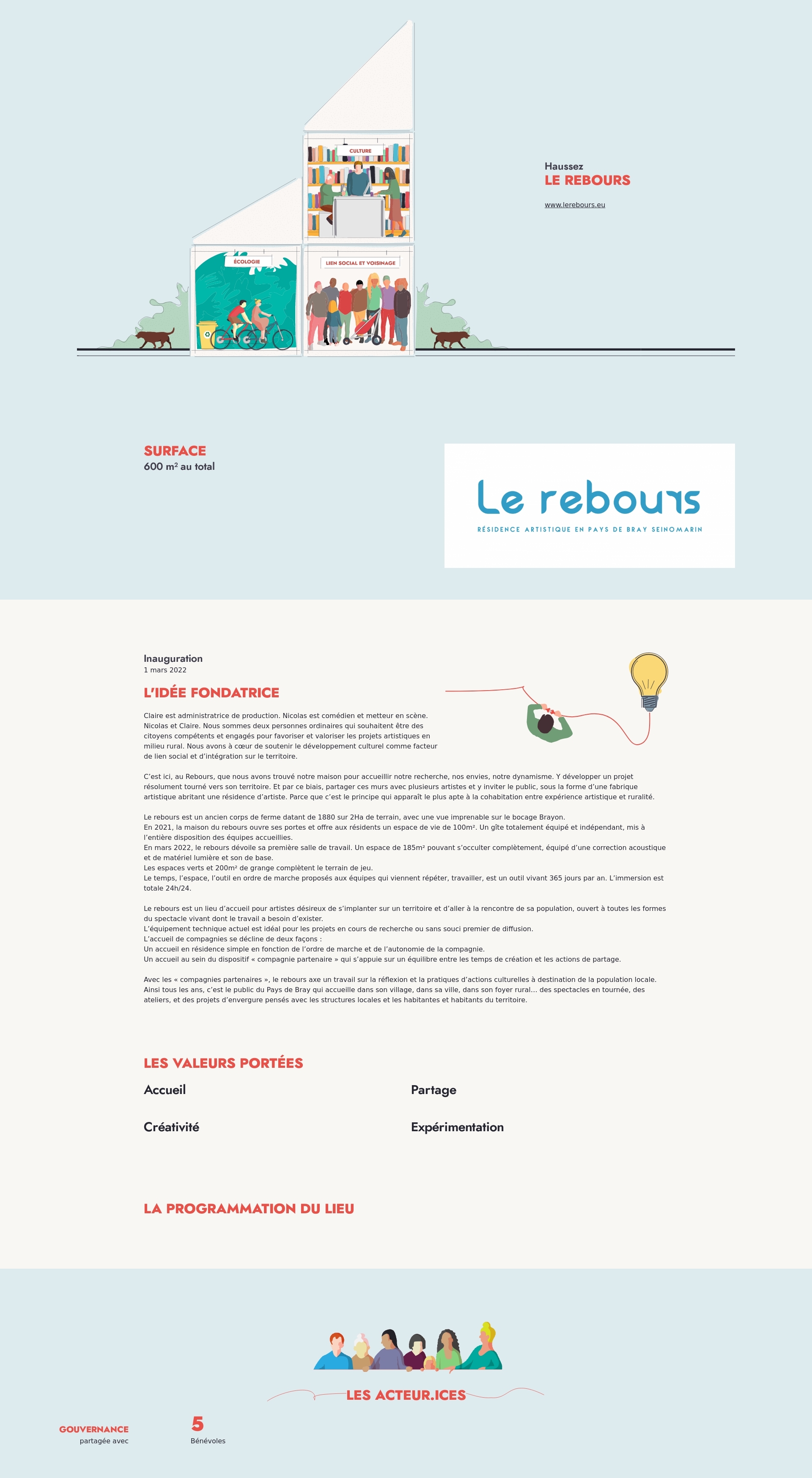 C’est ici, au Rebours, que nous avons trouvé notre maison pour accueillir notre recherche, nos envies, notre dynamisme. Y développer un projet résolument tourné vers son territoire. Et par ce biais, partager ces murs avec plusieurs artistes et y inviter le public, sous la forme d’une fabrique artistique abritant une résidence d’artiste. Parce que c’est le principe qui apparaît le plus apte à la cohabitation entre expérience artistique et ruralité.