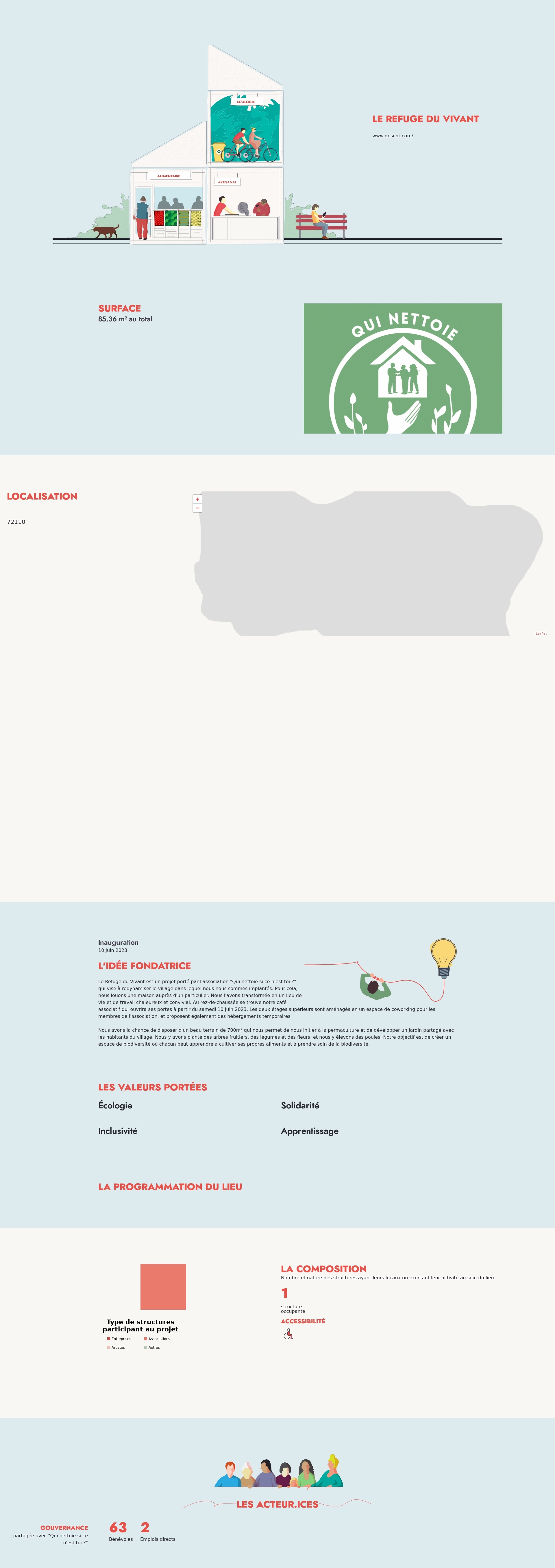 Le Refuge du Vivant est un projet porté par l'association "Qui nettoie si ce n'est toi ?" qui vise à redynamiser le village dans lequel nous nous sommes implantés. Pour cela, nous louons une maison auprès d'un particulier. Nous l'avons transformée en un lieu de vie et de travail chaleureux et convivial. Au rez-de-chaussée se trouve notre café associatif qui ouvrira ses portes à partir du samedi 10 juin 2023. Les deux étages supérieurs sont aménagés en un espace de coworking pour les membres de l'association, et proposent également des hébergements temporaires.