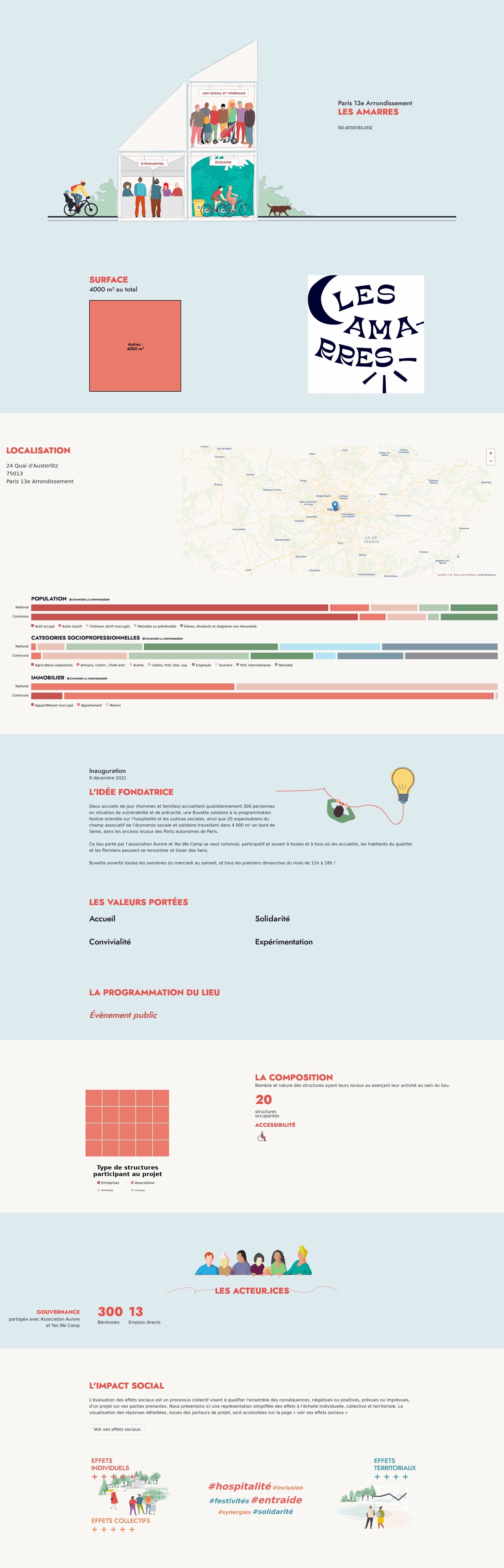 Deux accueils de jour (hommes et familles) accueillant quotidiennement 300 personnes en situation de vulnérabilité et de précarité, une Buvette solidaire à la programmation festive orientée sur l’hospitalité et les justices sociales, ainsi que 20 organisations du champ associatif de l’économie sociale et solidaire travaillant dans 4 000 m² en bord de Seine, dans les anciens locaux des Ports autonomes de Paris.