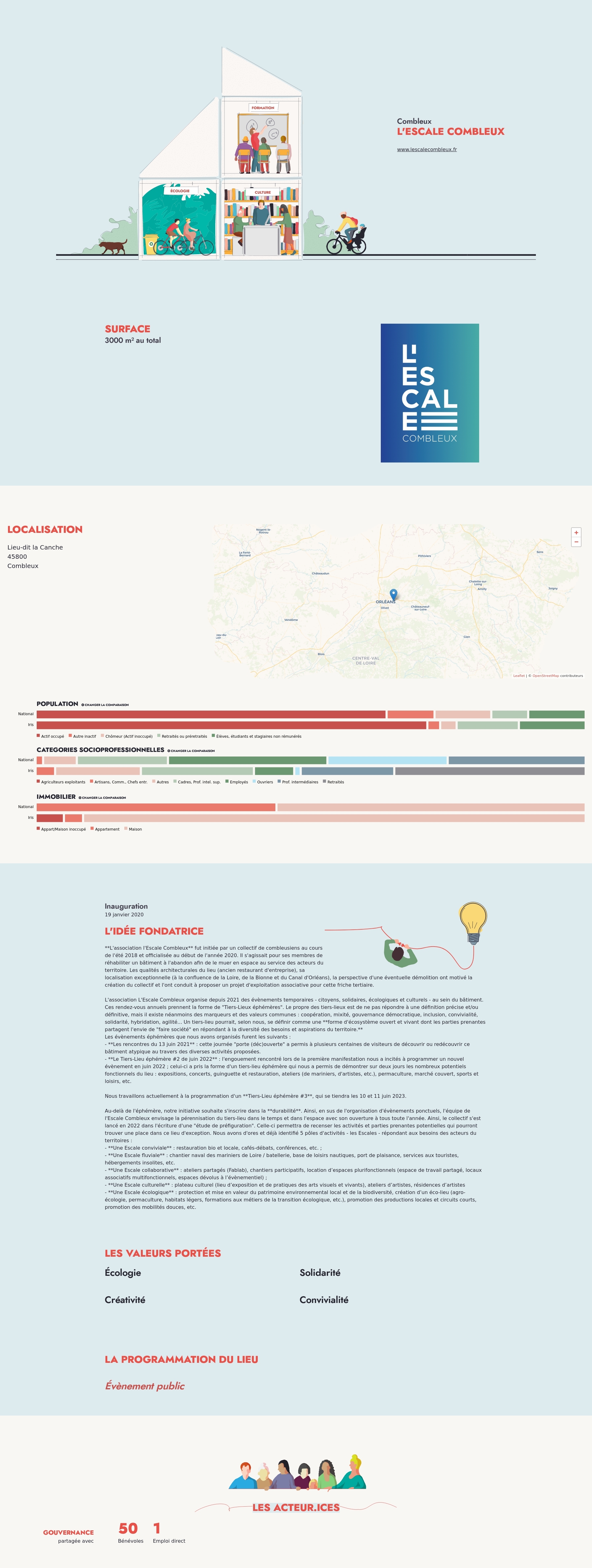 Au-delà de l'éphémère, notre initiative souhaite s'inscrire dans la **durabilité**. Ainsi, en sus de l'organisation d'évènements ponctuels, l'équipe de l'Escale Combleux envisage la pérennisation du tiers-lieu dans le temps et dans l'espace avec son ouverture à tous toute l'année. Ainsi, le collectif s'est lancé en 2022 dans l'écriture d'une "étude de préfiguration". Celle-ci permettra de recenser les activités et parties prenantes potentielles qui pourront trouver une place dans ce lieu d'exception. Nous avons d'ores et déjà identifié 5 pôles d'activités - les Escales - répondant aux besoins des acteurs du territoires :