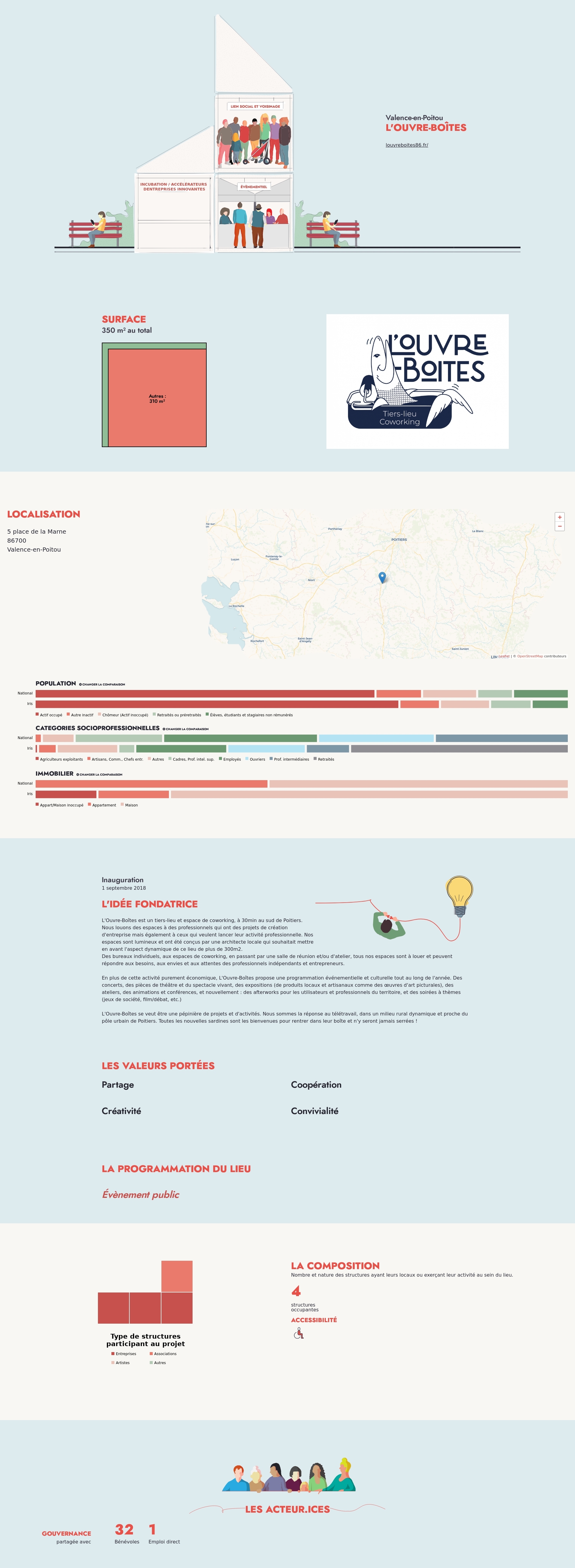 L'Ouvre-Boîtes est un tiers-lieu et espace de coworking, à 30min au sud de Poitiers. Nous louons des espaces à des professionnels qui ont des projets de création d'entreprise mais également à ceux qui veulent lancer leur activité professionnelle. Nos espaces sont lumineux et ont été conçus par une architecte locale qui souhaitait mettre en avant l'aspect dynamique de ce lieu de plus de 300m2.