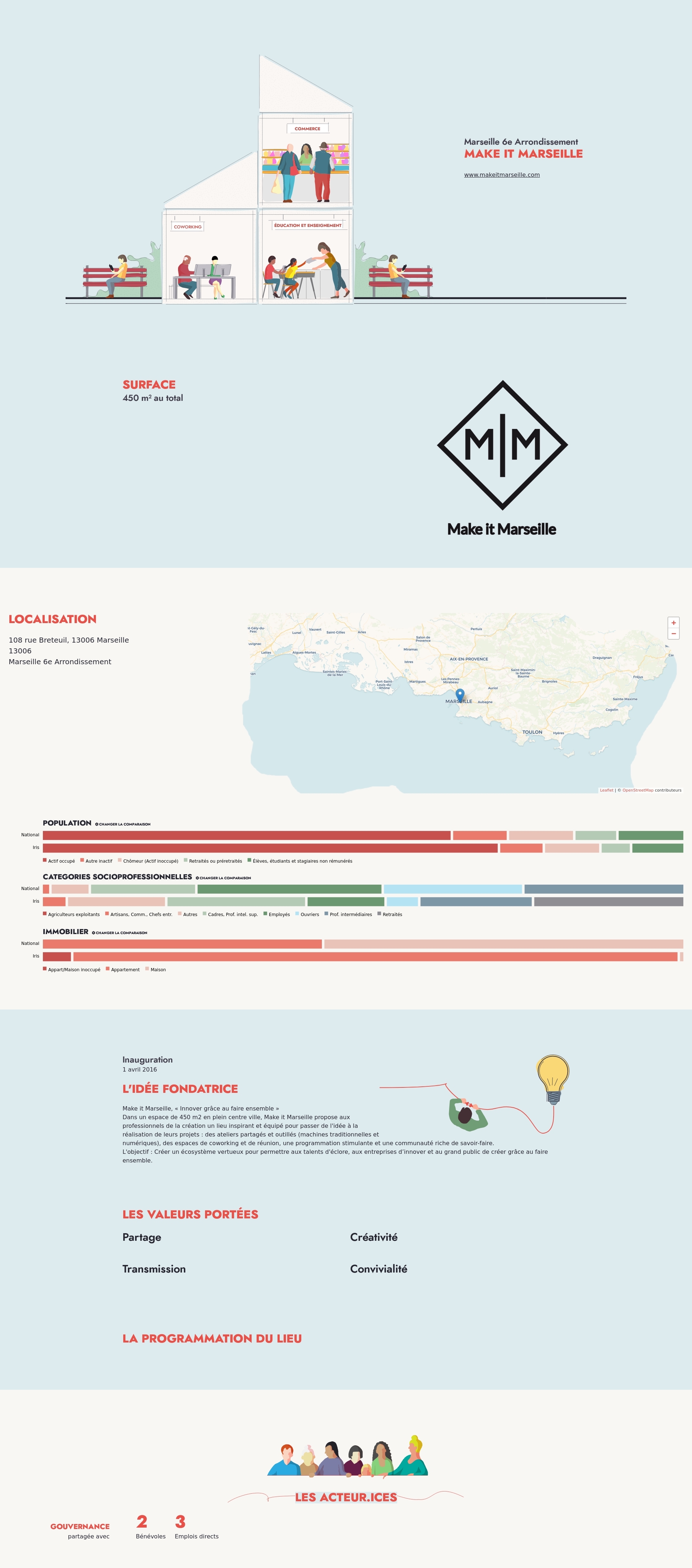 Dans un espace de 450 m2 en plein centre ville, Make it Marseille propose aux professionnels de la création un lieu inspirant et équipé pour passer de l'idée à la réalisation de leurs projets : des ateliers partagés et outillés (machines traditionnelles et numériques), des espaces de coworking et de réunion, une programmation stimulante et une communauté riche de savoir-faire.