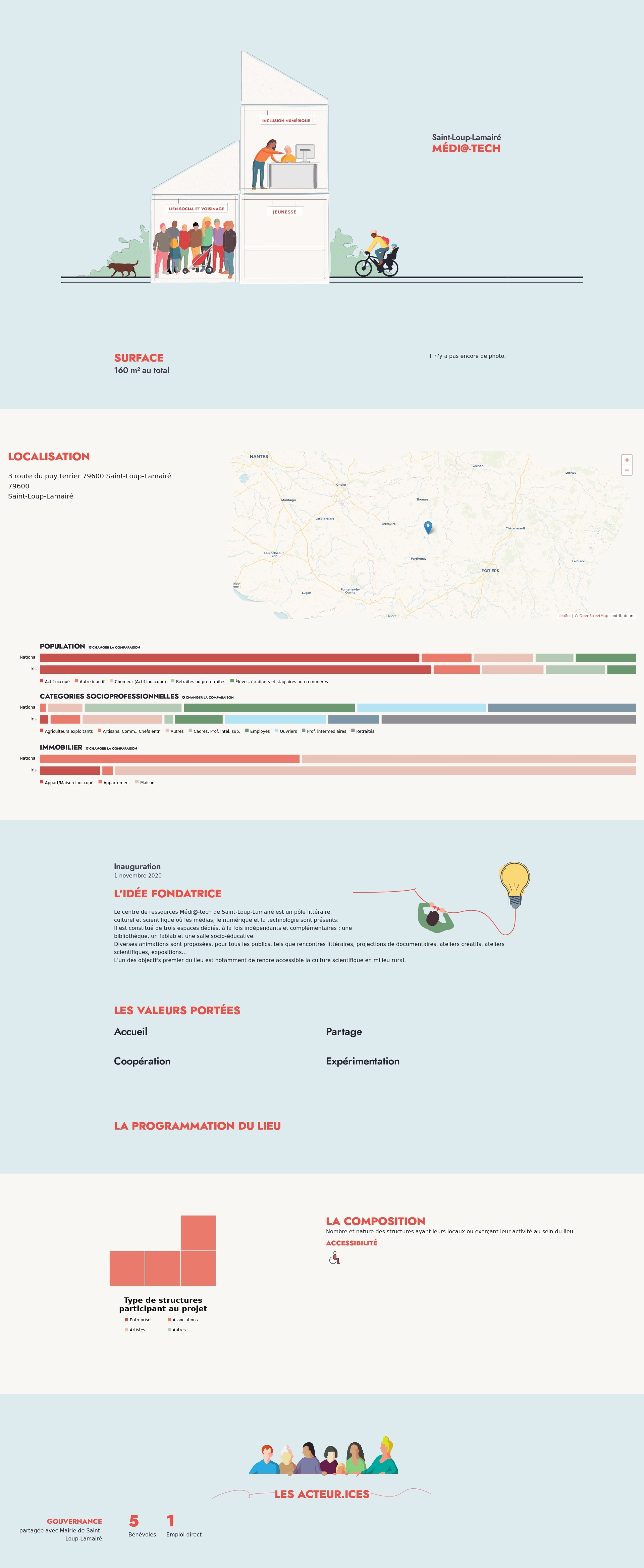 Il est constitué de trois espaces dédiés, à la fois indépendants et complémentaires : une bibliothèque, un fablab et une salle socio-éducative.