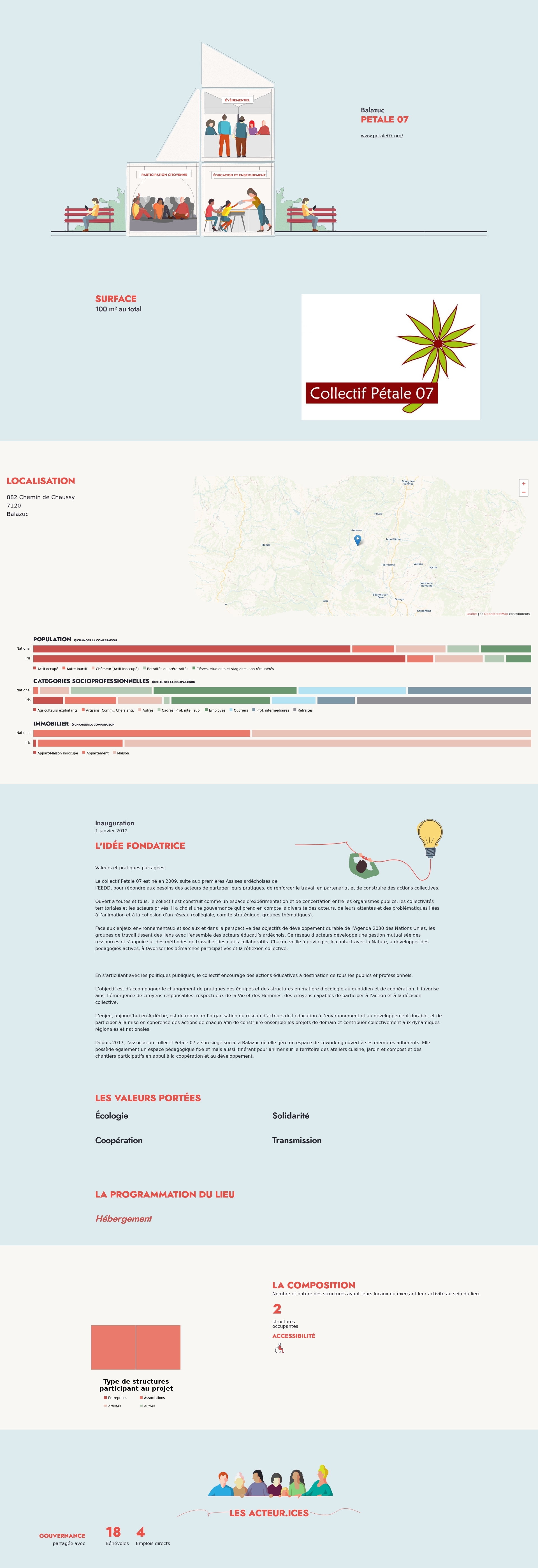 Depuis 2017, l'association collectif Pétale 07 a son siège social à Balazuc où elle gère un espace de coworking ouvert à ses membres adhérents. Elle possède également un espace pédagogique fixe et mais aussi itinérant pour animer sur le territoire des ateliers cuisine, jardin et compost et des chantiers participatifs en appui à la coopération et au développement.
