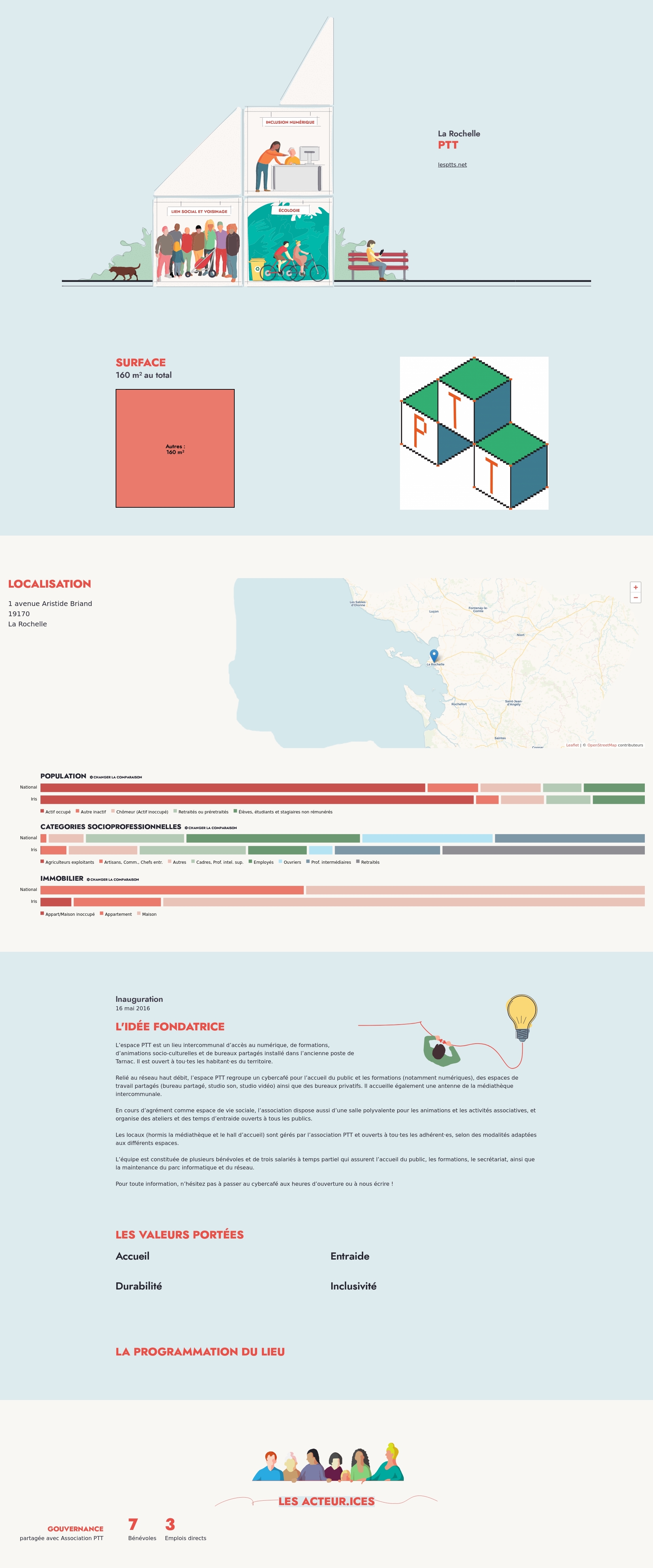 Relié au réseau haut débit, l’espace PTT regroupe un cybercafé pour l’accueil du public et les formations (notamment numériques), des espaces de travail partagés (bureau partagé, studio son, studio vidéo) ainsi que des bureaux privatifs. Il accueille également une antenne de la médiathèque intercommunale.