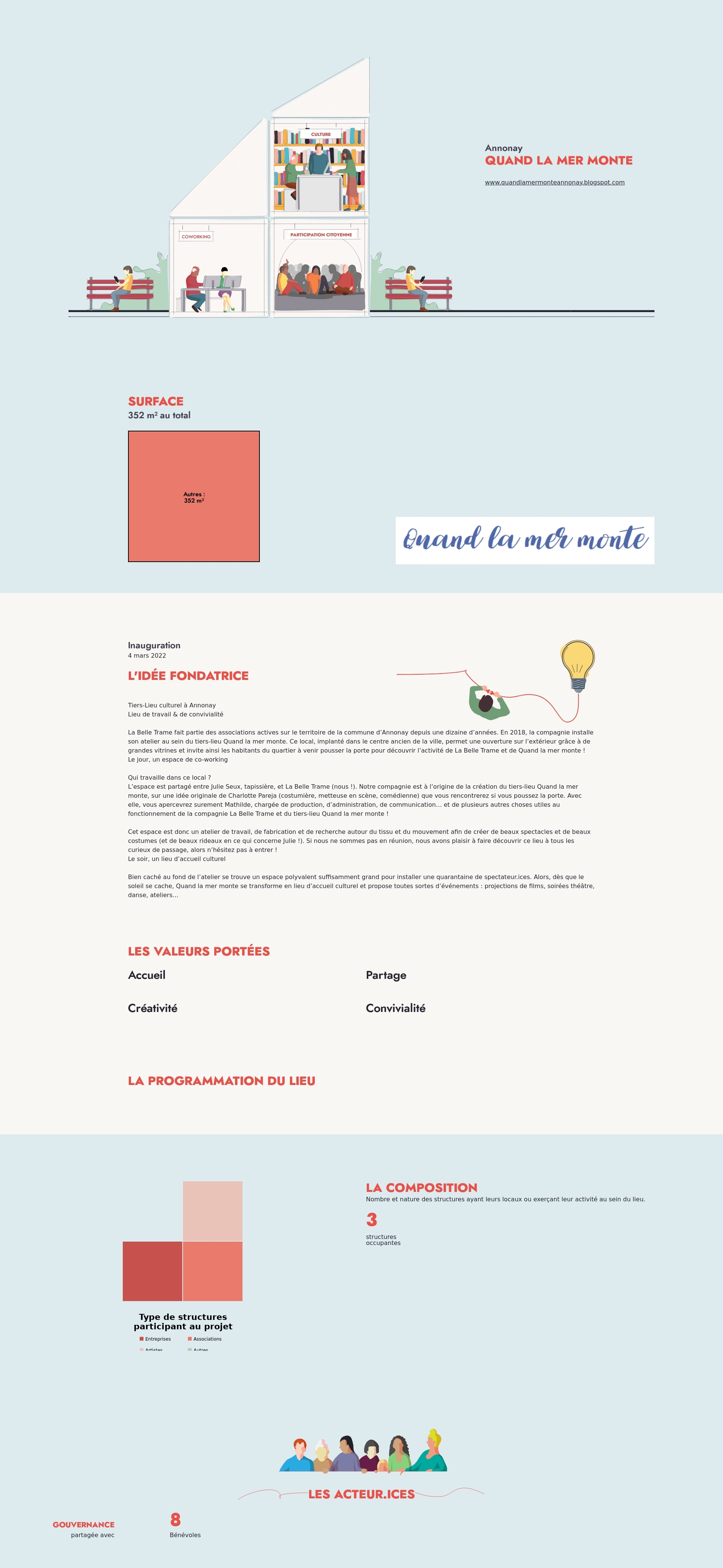 L’espace est partagé entre Julie Seux, tapissière, et La Belle Trame (nous !). Notre compagnie est à l’origine de la création du tiers-lieu Quand la mer monte, sur une idée originale de Charlotte Pareja (costumière, metteuse en scène, comédienne) que vous rencontrerez si vous poussez la porte. Avec elle, vous apercevrez surement Mathilde, chargée de production, d’administration, de communication… et de plusieurs autres choses utiles au fonctionnement de la compagnie La Belle Trame et du tiers-lieu Quand la mer monte !