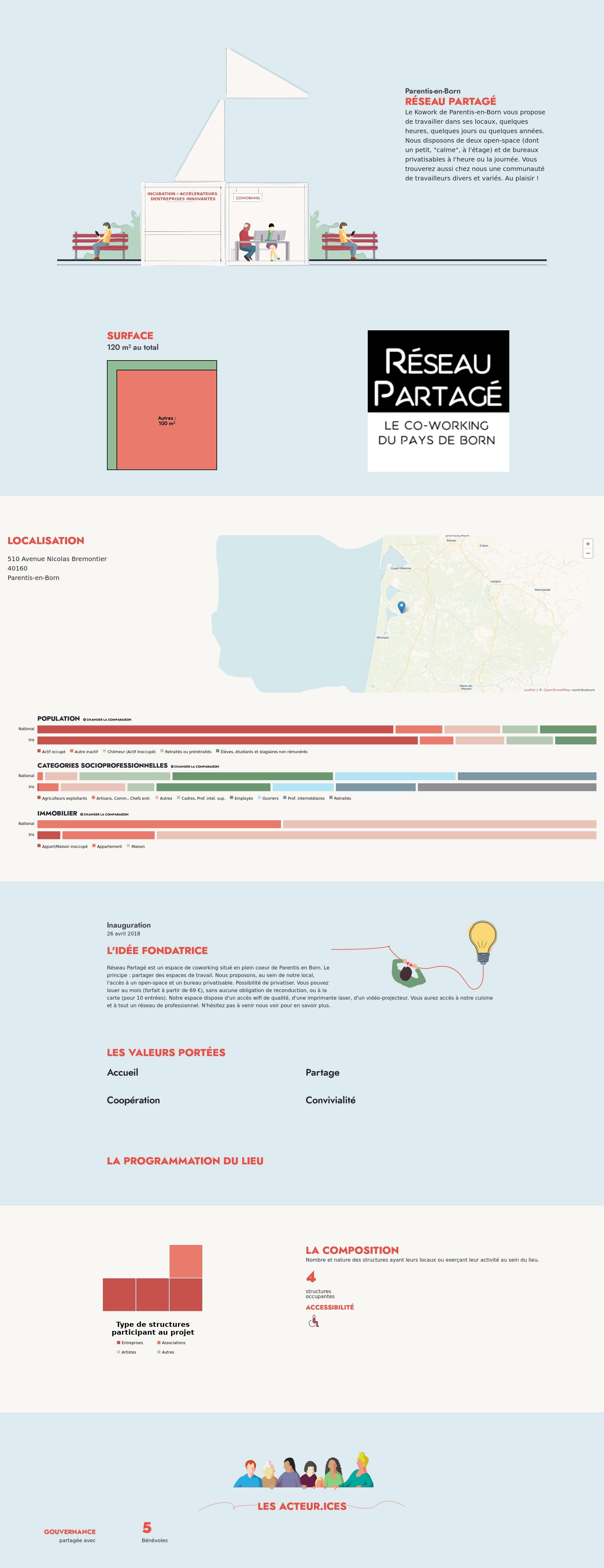 Réseau Partagé est un espace de coworking situé en plein coeur de Parentis en Born. Le principe : partager des espaces de travail. Nous proposons, au sein de notre local, l'accès à un open-space et un bureau privatisable. Possibilité de privatiser. Vous pouvez louer au mois (forfait à partir de 69 €), sans aucune obligation de reconduction, ou à la carte (pour 10 entrées). Notre espace dispose d'un accès wifi de qualité, d'une imprimante laser, d'un vidéo-projecteur. Vous aurez accès à notre cuisine et à tout un réseau de professionnel. N'hésitez pas à venir nous voir pour en savoir plus.